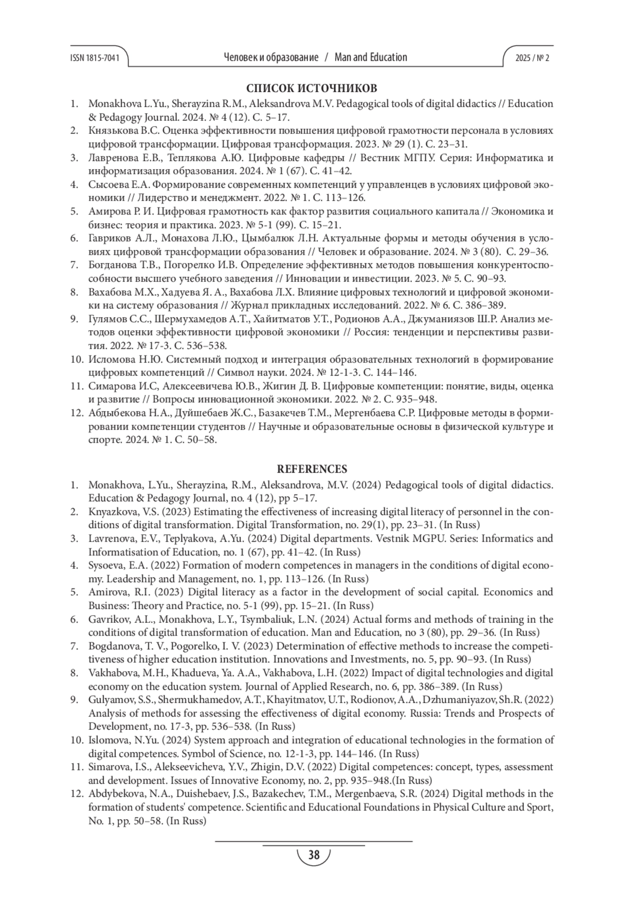 1. Monakhova L.Yu., Sherayzina R.M., Aleksandrova M.V. Pedagogical tools of digital didactics // Education & Pedagogy Journal. 2024. № 4 (12). С. 5-17.