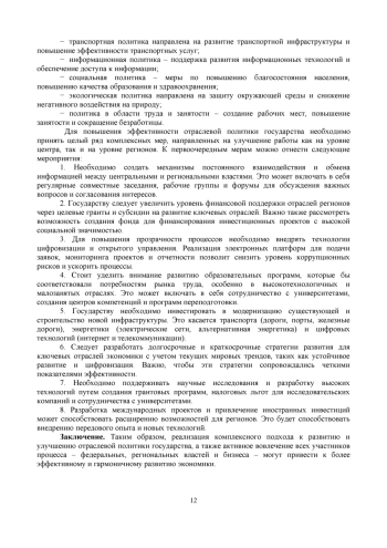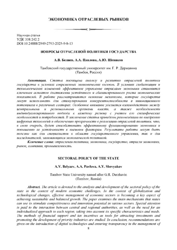 Статья посвящена анализу и развитию отраслевой политики государства в условиях современных экономических вызовов. В условиях глобализации и технологических изменений эффективное управление отраслями экономики становится ключевым аспектом достижения устойчивого и сбалансированного роста экономических показателей. В работе рассматриваются основные механизмы, которые государства могут использовать для стимулирования конкурентоспособности и инновационного потенциала в различных секторах. Особенное внимание уделяется взаимодействию между центральными и региональными органами власти, а также необходимости индивидуализированного подхода к каждому региону с учетом его специфических особенностей и потребностей. В заключение статьи приведены рекомендации по внедрению цифровых технологий и обеспечению прозрачности в реализации отраслевой политики, что, в свою очередь, будет способствовать эффективному функционированию экономики и повышению ее устойчивости к внешним факторам. Результаты работы могут быть полезны как для специалистов в области государственного управления, так и для исследователей, занимающихся экономической политикой.