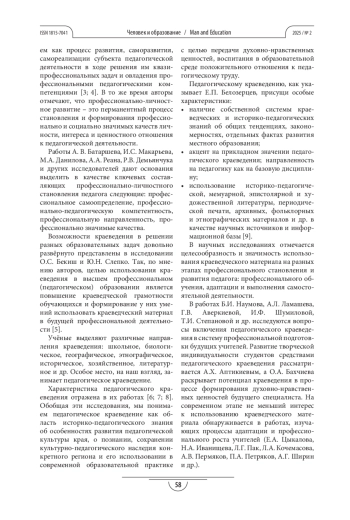 7. Иванищева Н.А., Пак Л.Г., Кочемасова Л.А. Новый формат педагогического краеведения в профессиональном росте учителя будущего: от осмысления к трансляции // Образование и саморазвитие. 2022. № 2. Т. 17. С. 270-284.