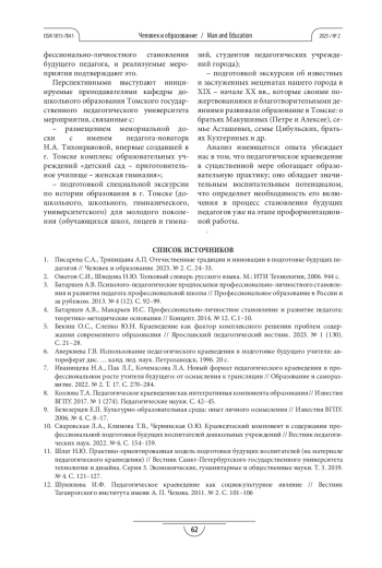 1. Писарева С.А., Тряпицына А.П. Отечественные традиции и инновации в подготовке будущих педагогов // Человек и образование. 2023. № 2. С. 24-33.