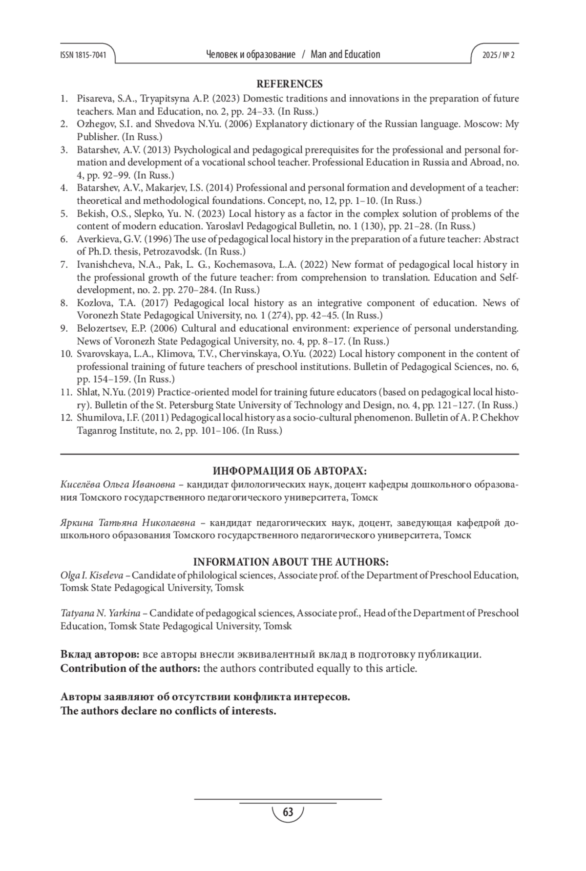 10. Сваровская Л.А., Климова Т.В., Червинская О.Ю. Краеведческий компонент в содержании профессиональной подготовки будущих воспитателей дошкольных учреждений // Вестник педагогических наук. 2022. № 6. С. 154-159.