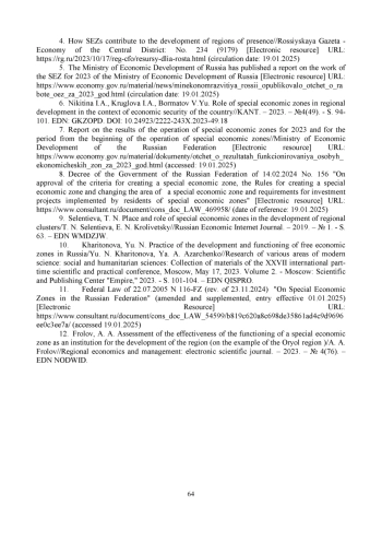 9. 	Селентьева, Т. Н. Место и роль особых экономических зон в развитии региональных кластеров / Т. Н. Селентьева, Э. Н. Кроливецкий // Российский экономический интернет-журнал. - 2019. - № 1. - С. 63. EDN: WMDZJW