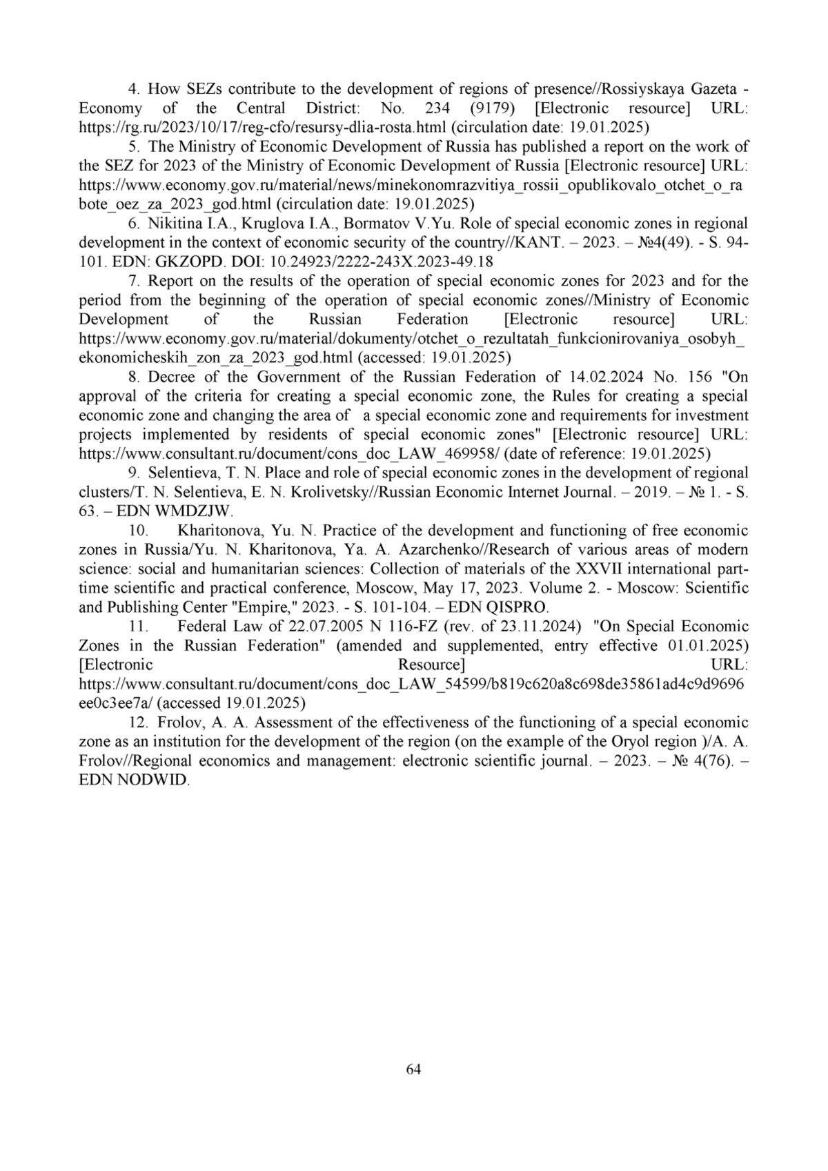 6. 	Никитина И.А., Круглова И.А., Борматов В.Ю. Роль особых экономических зон в региональном развитии в контексте экономической безопасности страны // KANT. - 2023. - №4(49). - С. 94-101. DOI: 10.24923/2222-243X.2023-49.18 EDN: GKZOPD