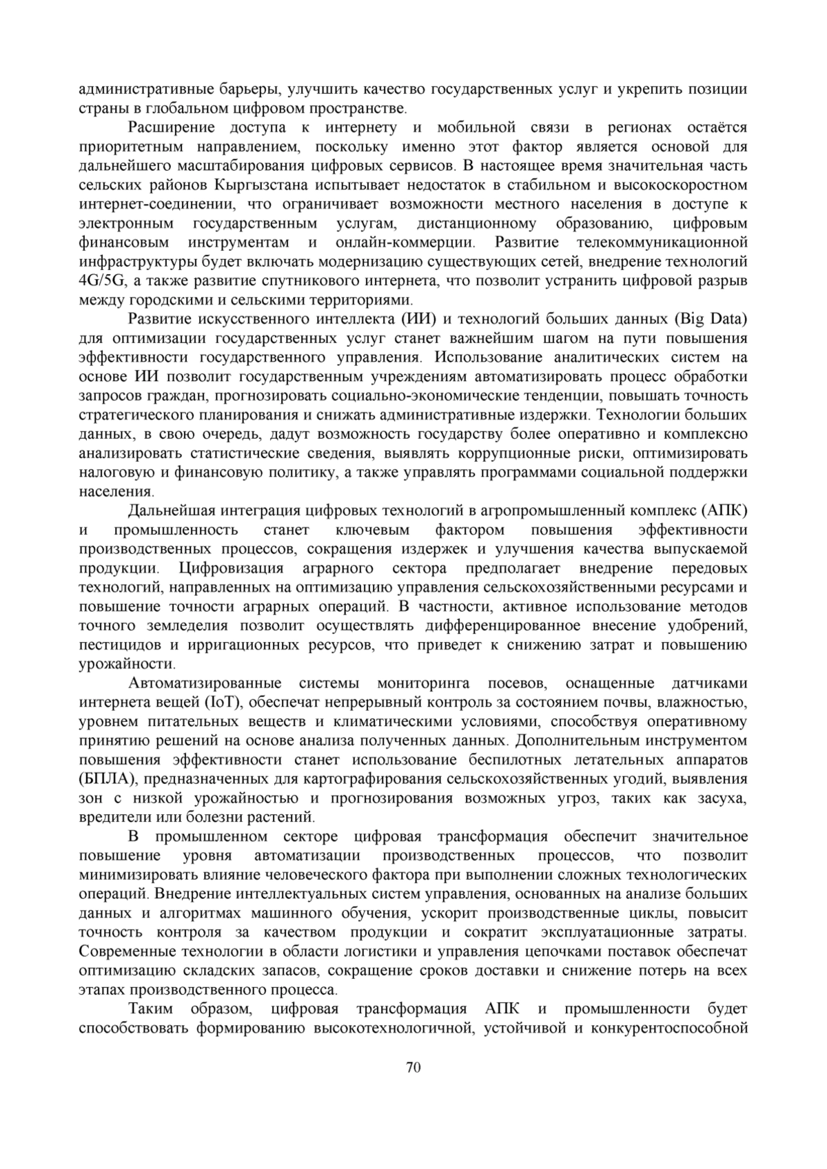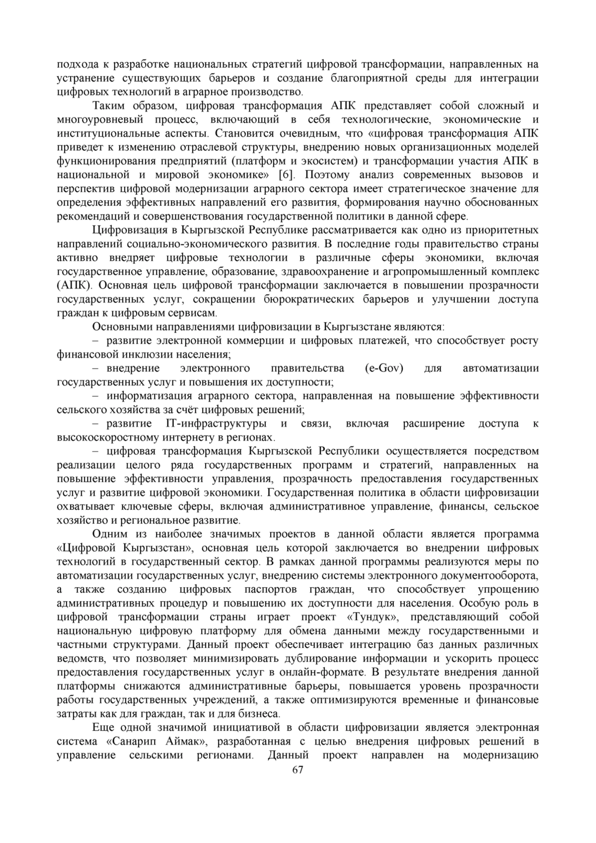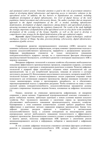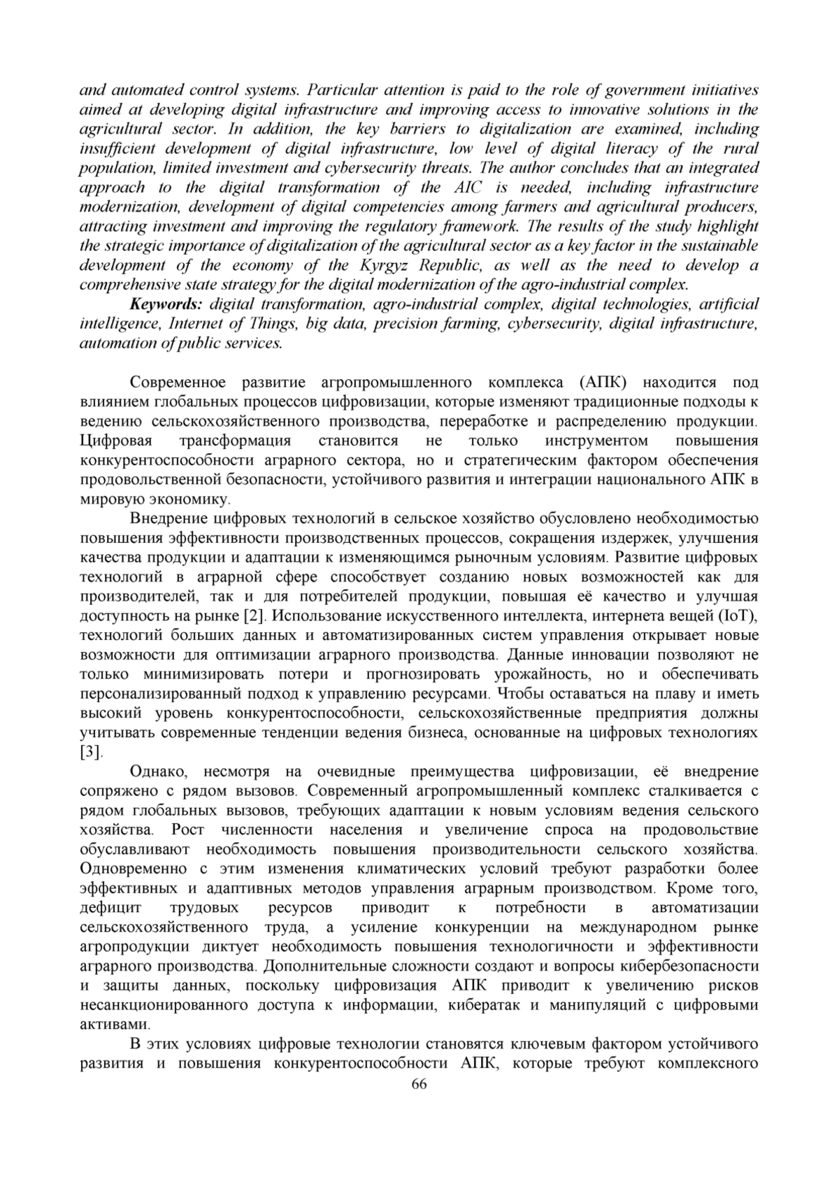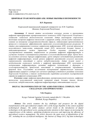 В данной статье исследуются ключевые вызовы и перспективы цифровой трансформации агропромышленного комплекса (АПК) Кыргызской Республики в контексте глобальных технологических изменений. Автор анализирует современные тенденции внедрения цифровых технологий в аграрный сектор, уделяя особое внимание их влиянию на повышение конкурентоспособности отрасли, оптимизацию производственных процессов и повышение эффективности управления сельскохозяйственными ресурсами. В статье рассматриваются основные направления цифровизации АПК, включая применение искусственного интеллекта, интернета вещей (IoT), технологий больших данных и автоматизированных систем управления. Особое внимание уделяется роли государственных инициатив, направленных на развитие цифровой инфраструктуры и улучшение доступа к инновационным решениям в сельскохозяйственной сфере. Кроме того, исследуются ключевые барьеры цифровизации, среди которых недостаточная развитость цифровой инфраструктуры, низкий уровень цифровой грамотности сельского населения, ограниченность инвестиций и угрозы кибербезопасности. Автор делает вывод о необходимости системного подхода к цифровой трансформации АПК, включающего модернизацию инфраструктуры, развитие цифровых компетенций у фермеров и сельхозпроизводителей, привлечение инвестиций и совершенствование нормативно-правовой базы. Результаты исследования подчеркивают стратегическую важность цифровизации аграрного сектора как ключевого фактора устойчивого развития экономики Кыргызской Республики, а также необходимость выработки целостной государственной стратегии цифровой модернизации АПК.