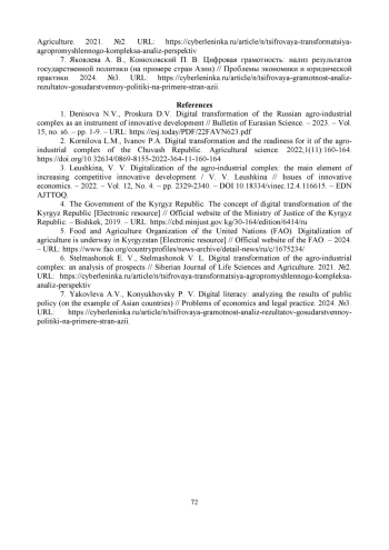 1. 	Денисова Н.В., Проскура Д.В. Цифровая трансформация агропромышленного комплекса России как инструмент инновационного развития // Вестник Евразийской науки. - 2023. - Т. 15, № s6. - С. 1-9. - URL: https://esj.today/PDF/22FAVN623.pdf.
