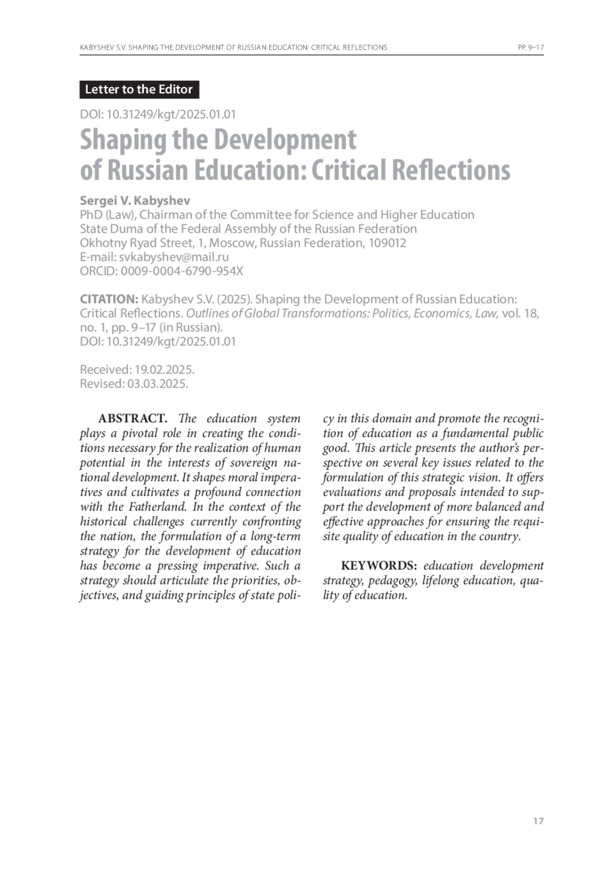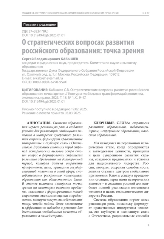 Система образования играет решающую роль в создании условий для реализации потенциала человека в интересах суверенного развития страны, формирует нравственные императивы и глубокую связь с Отечеством. В условиях стоящих перед страной исторических вызовов остро стоит вопрос о формировании стратегии развития образования на долгосрочный период, которая должна отражать приоритеты, цели, принципы государственной политики в этой сфере, способствовать раскрытию потенциала образования как общественного блага. В статье изложена авторская точка зрения на некоторые основные проблемы, связанные с формированием такой стратегии, высказаны оценки и предложения, которые могут способствовать тому, чтобы найти более взвешенные и эффективные подходы и решения для достижения необходимого качества образования в нашей стране.
