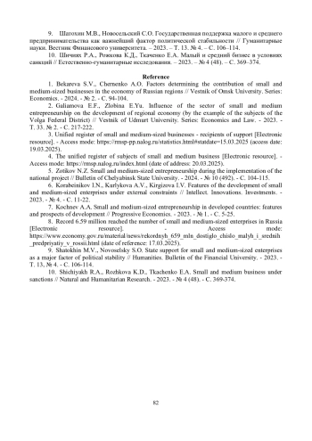 9. 	Шатохин М.В., Новосельский С.О. Государственная поддержка малого и среднего предпринимательства как важнейший фактор политической стабильности // Гуманитарные науки. Вестник Финансового университета. - 2023. - Т. 13. № 4. - С. 106-114.