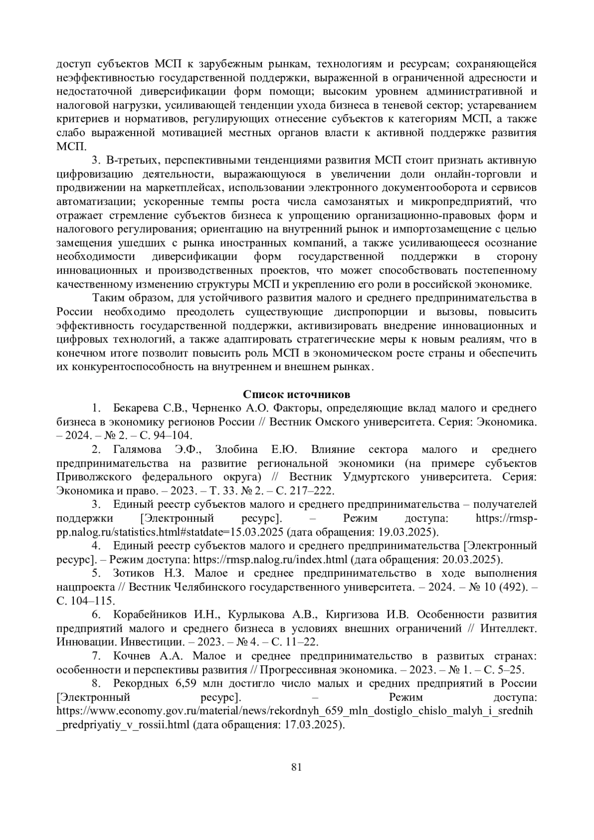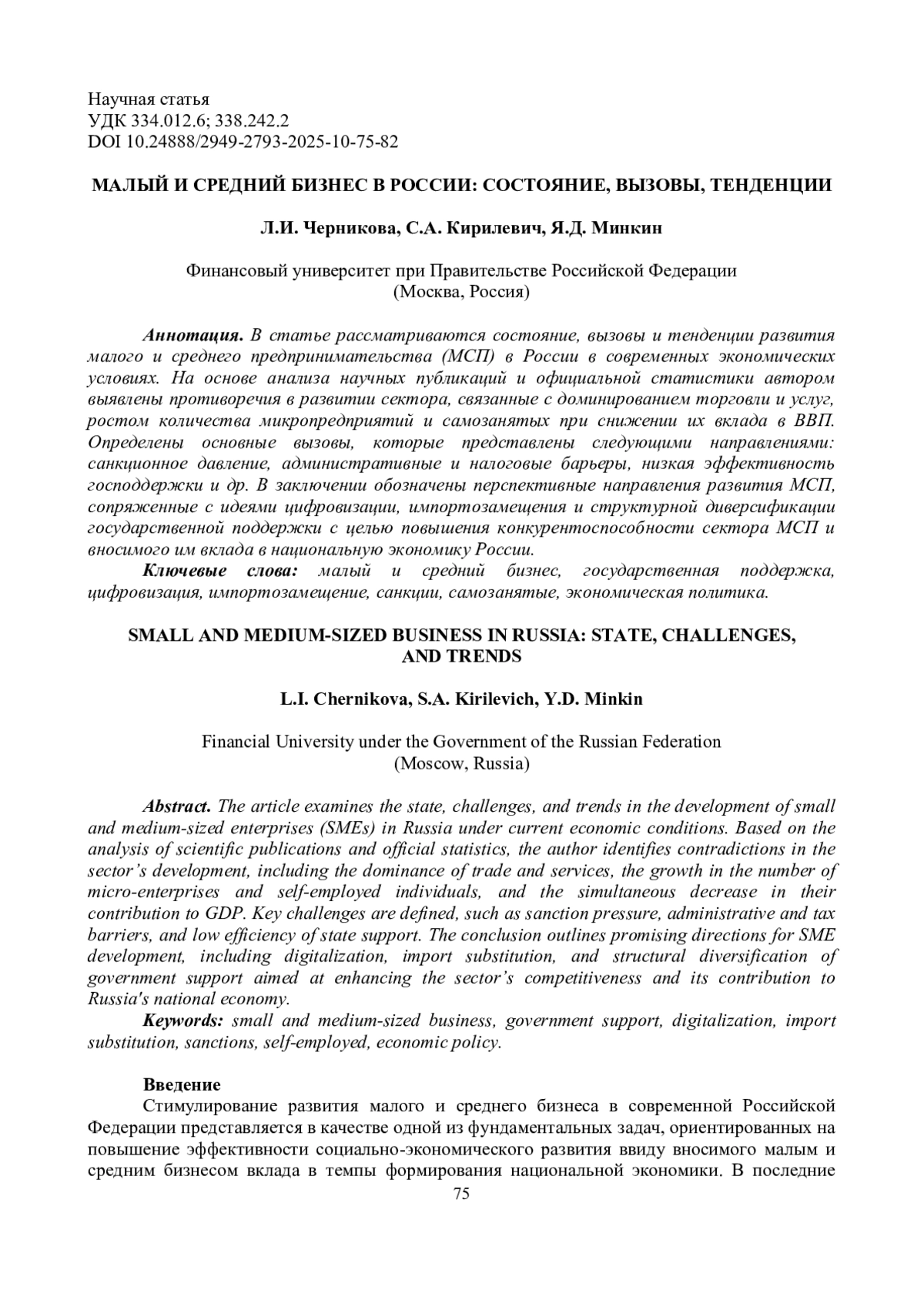 6. 	Корабейников И.Н., Курлыкова А.В., Киргизова И.В. Особенности развития предприятий малого и среднего бизнеса в условиях внешних ограничений // Интеллект. Инновации. Инвестиции. - 2023. - № 4. - С. 11-22.