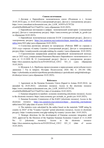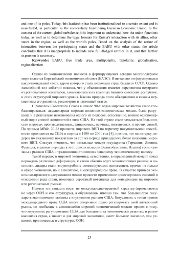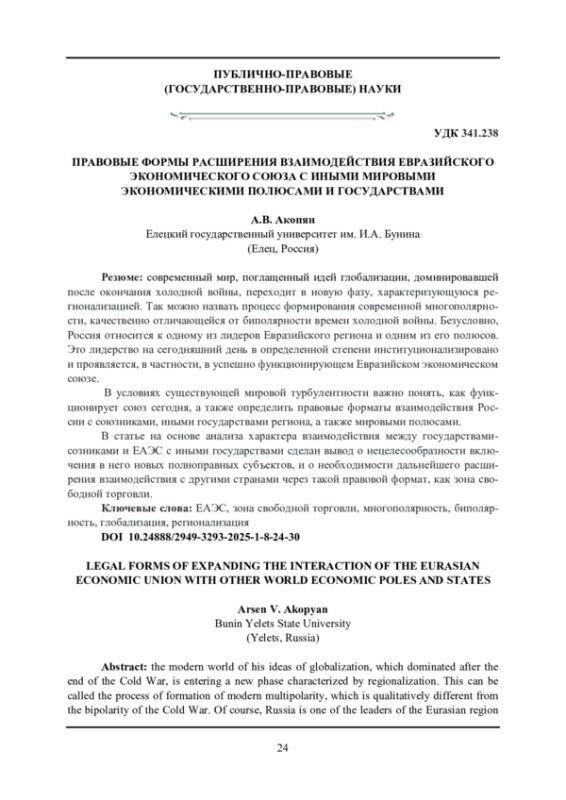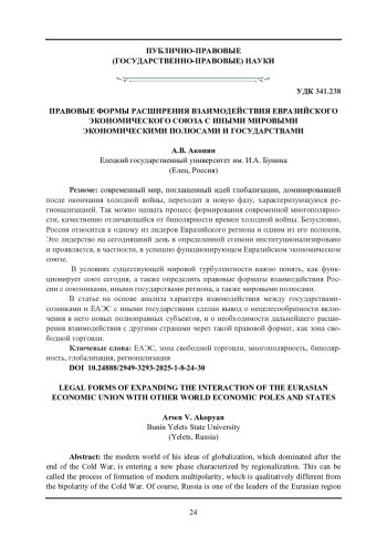 Современный мир, поглащенный идей глобализации, доминировавшей после окончания холодной войны, переходит в новую фазу, характеризующуюся регионализацией. Так можно назвать процесс формирования современной многополярности, качественно отличающейся от биполярности времен холодной войны. Безусловно, Россия относится к одному из лидеров Евразийского региона и одним из его полюсов. Это лидерство на сегодняшний день в определенной степени институционализировано и проявляется, в частности, в успешно функционирующем Евразийском экономическом союзе. В условиях существующей мировой турбулентности важно понять, как функционирует союз сегодня, а также определить правовые форматы взаимодействия России с союзниками, иными государствами региона, а также мировыми полюсами. В статье на основе анализа характера взаимодействия между государствами-созниками и ЕАЭС с иными государствами сделан вывод о нецелесообразности включения в него новых полноправных субъектов, и о необходимости дальнейшего расширения взаимодействия с другими странами через такой правовой формат, как зона свободной торговли.