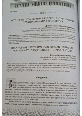 Попов А., диак. Ектения об оглашенных в русской церковной традиции начала XXI в. // Вестник Омской духовной семинарии. - 2024. - №2 (17). - С.112-117.
