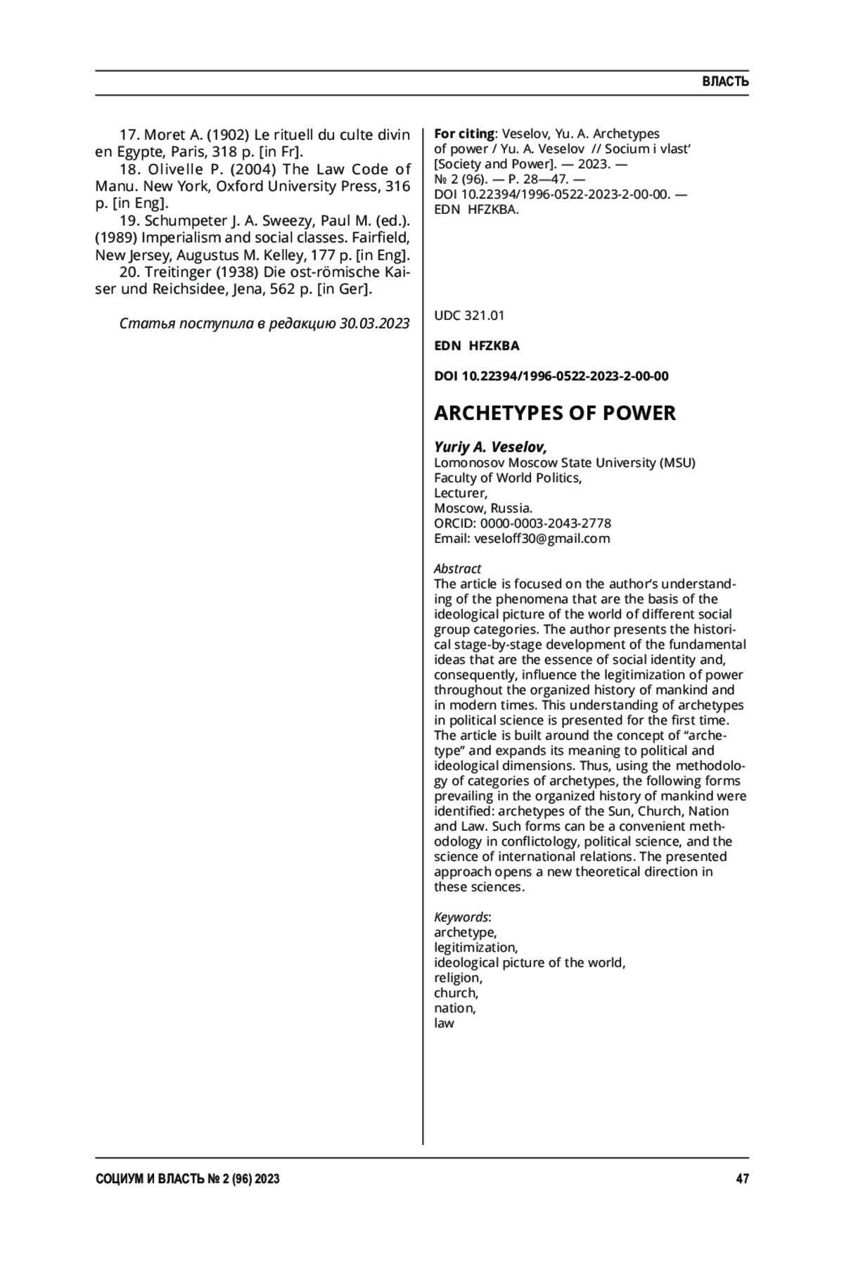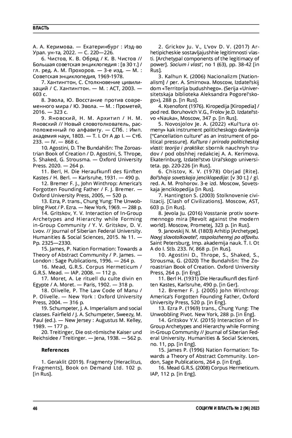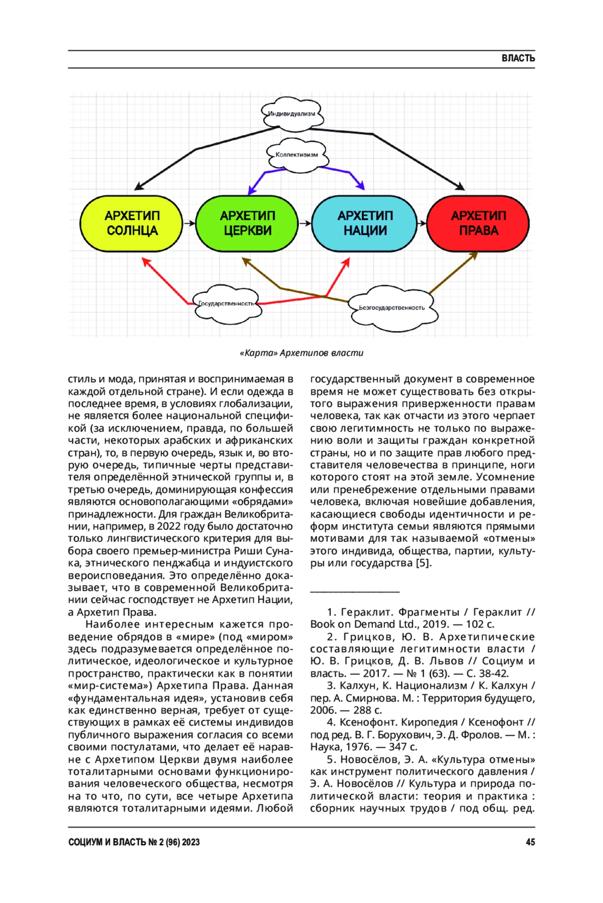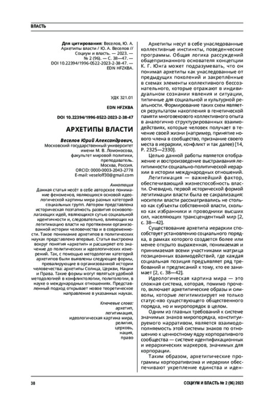 2. 	Грицков, Ю. В. Архетипические составляющие легитимности власти / Ю. В. Грицков, Д. В. Львов // Социум и власть. - 2017. - № 1 (63). - С. 38-42.  EDN: YKROHH