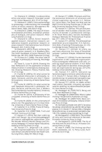 29. Hansen F.T. (2008). Phronesis and Eros: the existential dimension of phronesis and clinical supervision og nurses. In C. Delmar & C. Johns (Eds.), The Good, the Wise and the Right Clinical Nursing Practice (pp. 27-58). Aalborg University Hospital Press [in Eng].
