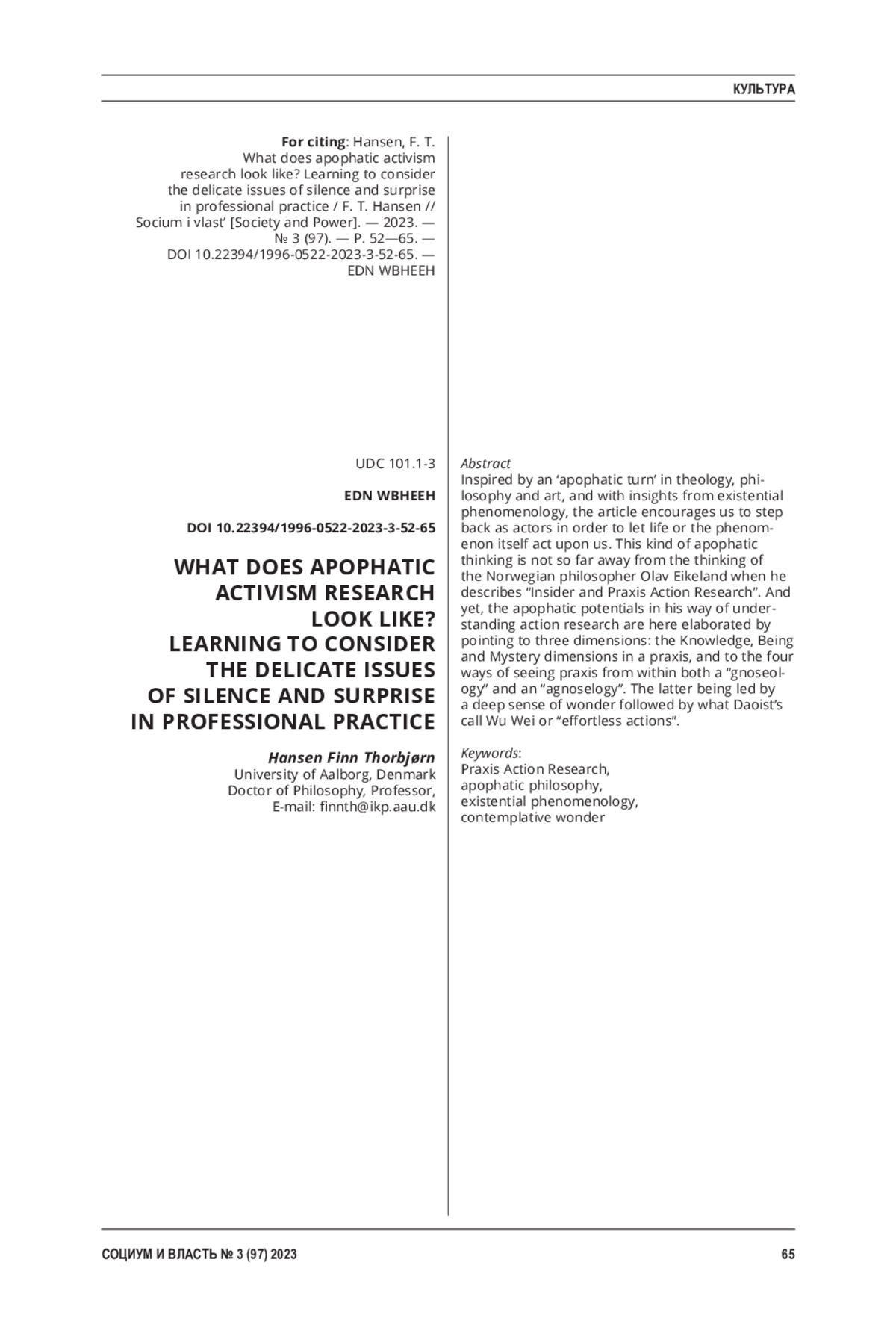 Вдохновленная «апофатическим поворотом» в теологии, философии и искусстве, а также экзистенциальной феноменологией, статья призывает нас смотреть на себя со стороны подобно актерам, чтобы позволить жизни или самому явлению воздействовать на нас. Этот тип апофатического мышления созвучен идеям норвежского философа Олафа Эйкеланда, когда он описывает «инсайдерское и практическое исследование активности». Апофатические возможности такого способа понимания исследования активности раскрываются в статье путем указания на три измерения: Знания, Бытия и Тайны, а также на четыре способа видения активности изнутри не только как «гносеологии», но и как «а-гносеологии». Последнее достигается глубоким чувством удивления, за которым следует то, что даосы называют У-Вэй, или «действие без усилий».