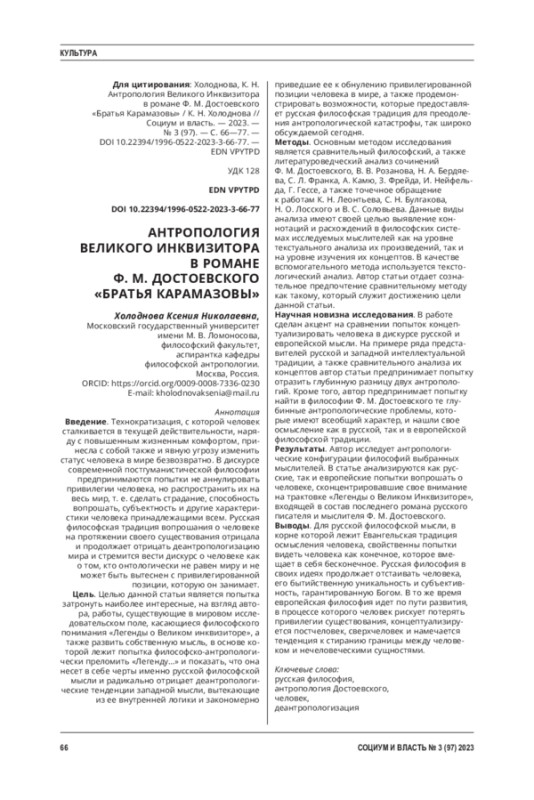 Цель. Целью данной статьи является попытка затронуть наиболее интересные, на взгляд автора, работы, существующие в мировом исследовательском поле, касающиеся философского понимания «Легенды о Великом инквизиторе», а также развить собственную мысль, в основе которой лежит попытка философско-антропологически преломить «Легенду…» и показать, что она несет в себе черты именно русской философской мысли и радикально отрицает деантропологические тенденции западной мысли, вытекающие из ее внутренней логики и закономерно приведшие ее к обнулению привилегированной позиции человека в мире, а также продемонстрировать возможности, которые предоставляет русская философская традиция для преодоления антропологической катастрофы, так широко обсуждаемой сегодня.
