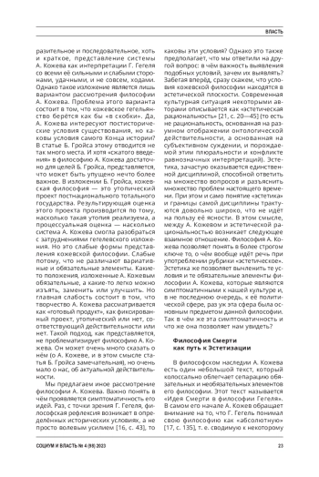 Результаты. Специфический режим интерпретации Г. Гегеля, который осуществляет А. Кожев, превращает философию первого в своеобразный эстетический проект. В этом проекте на передний план выходит категория эстетического опыта, указывающая на пустой, формальный характер любого дискурса. В этой связи всякая претензия на знание действительности, на верное представление о предмете заменяется идеей творческого создания предмета дискурса. Последовательное рассмотрение этой идеи и является симптоматикой философии А. Кожева. Такая философия является отражением тех исторических изменений, которые породили культуру «эстетической рациональности »: пустую и формальную. В философии А. Кожева можно увидеть, как подобная культура Конца истории является, вопреки гегельянским представлениям, не эпохой заката борьбы, а эпохой её странной трансформации, симптомом возрастания политического насилия.