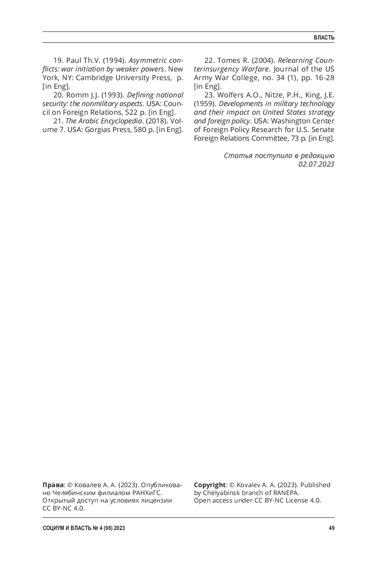 Введение. Война занимает особое место в развитии человечества, т. к. представляет собой неотъемлемую часть его истории. Проблема войны является предметом междисциплинарных исследований на протяжении всего периода становления социальных наук. Осмысление противоборства народов и отдельных социальных групп имеет место в философской мысли со времен возникновения первых крупных цивилизаций. На современном этапе развития общества проблематика войны тесно сопряжена с феноменом национальной безопасности, которая направлена на защиту государства от внутренних и внешних угроз и предупреждение рисков, посягающих на гармоничное развитие человека и общества, инфраструктуру, экономику, а также социально-политическое благополучие нации.