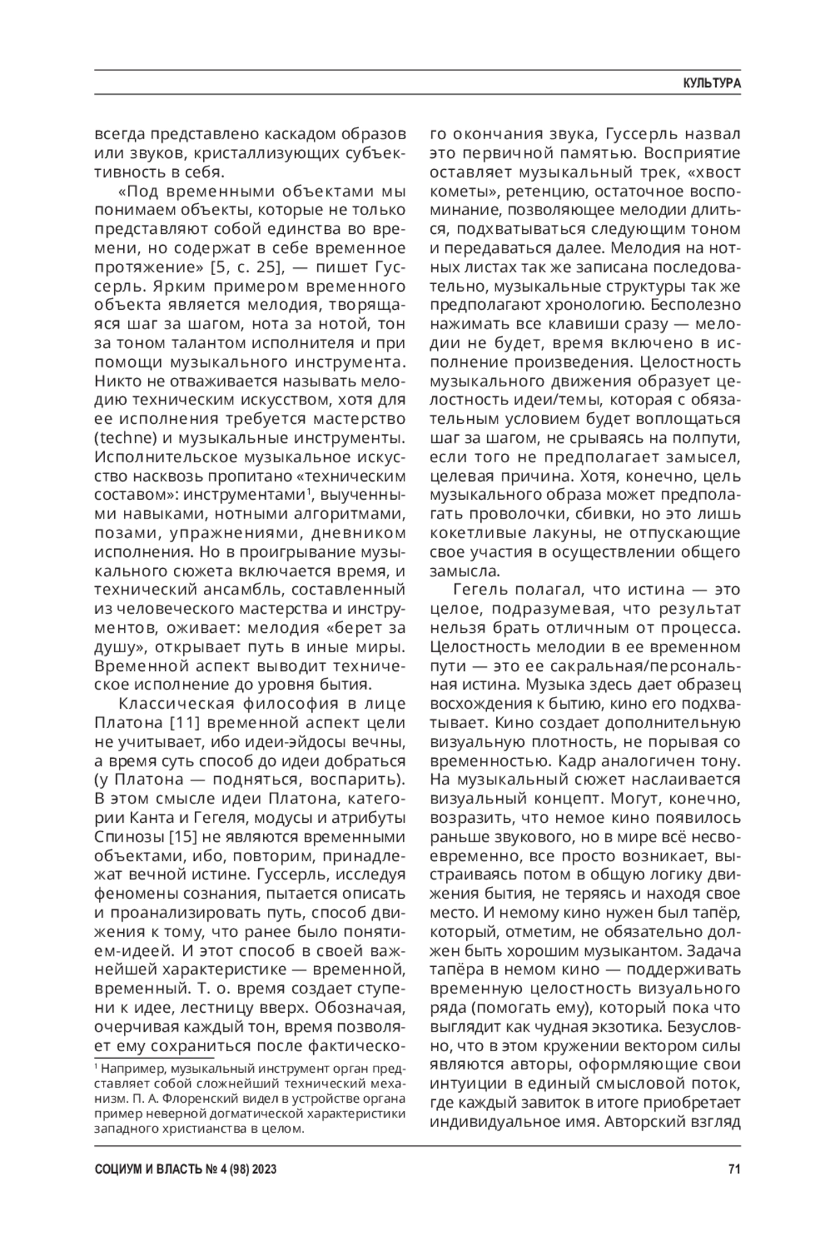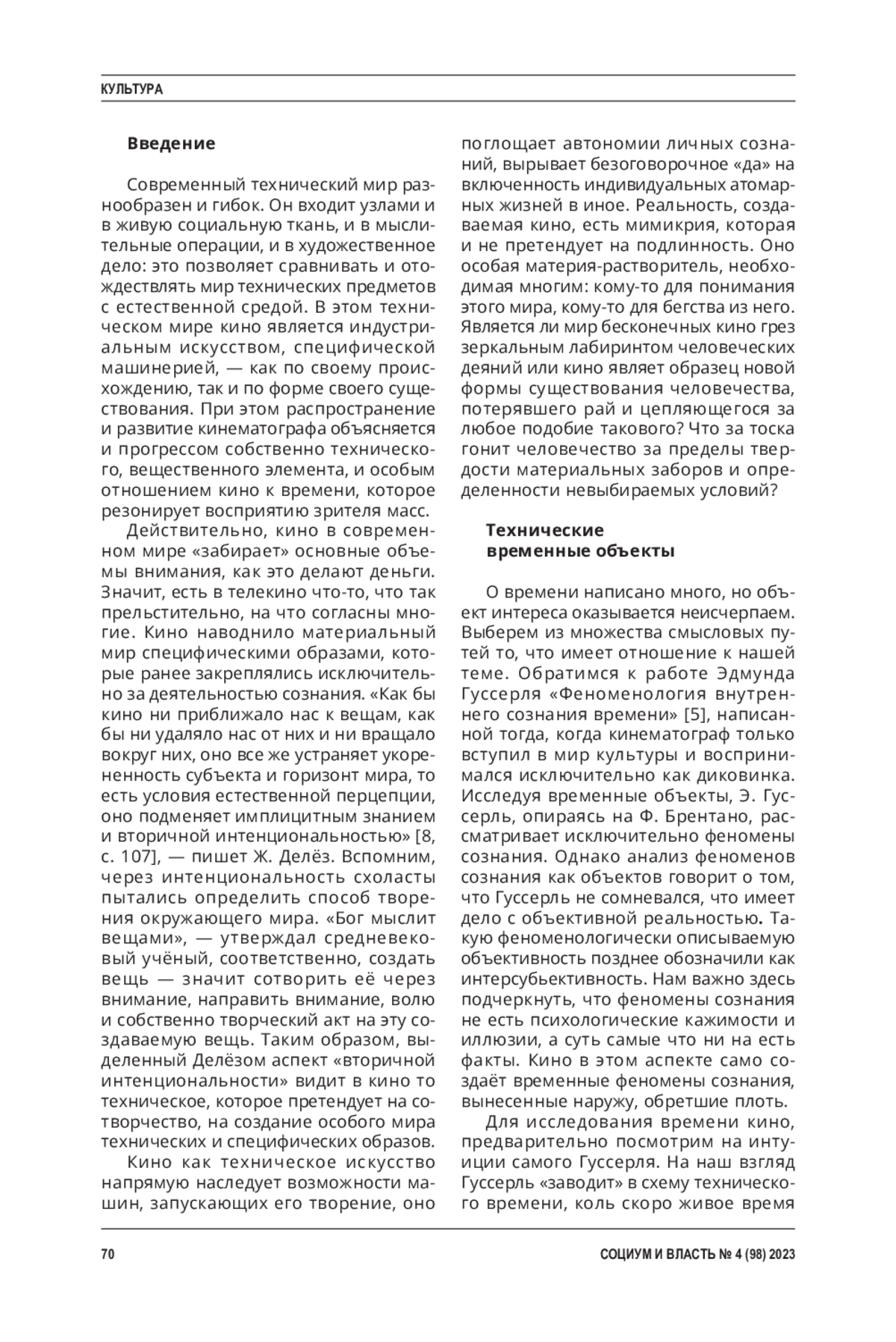 Методы. В работе используется феноменологический метод, позволяющий за «непрозрачным телом» кино видеть временную ткань. Эйдетическая редукция к основаниям сконструированной временной реальности киносюжетов дополняется структуралистским методом анализа технических устройств и технологических приемов кинопромышленности. Научная новизна. Онтология технического искусства кино выходит за грани рациональности и прагматики. Запуская особого рода эксперимент со временем, технологии кино позволяют присутствовать зрителю в бифуркационных моментах временных метаморфоз, соединяющих различные временные модусы. Временная ткань подчинена сюжетной логике.