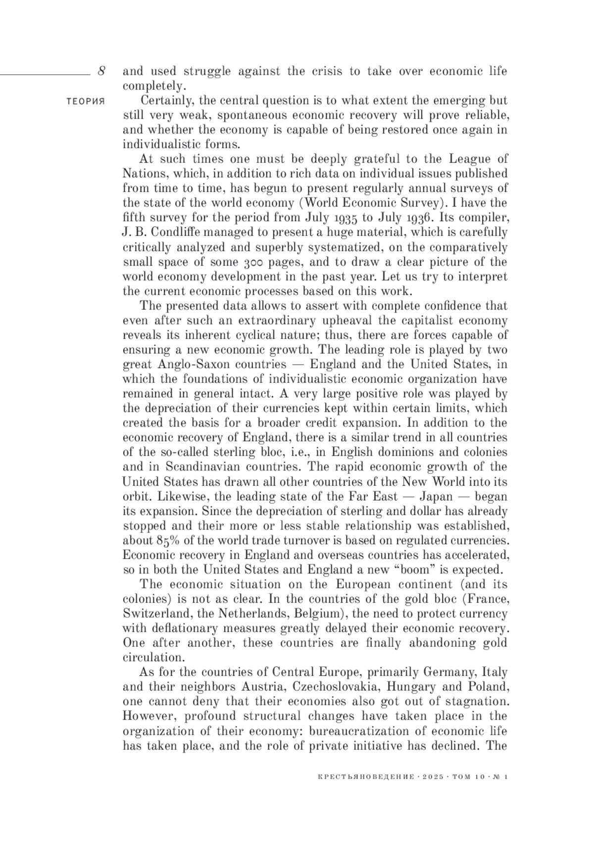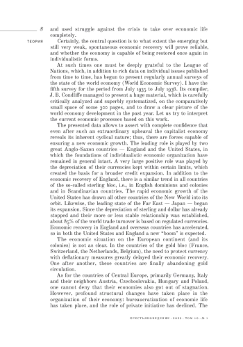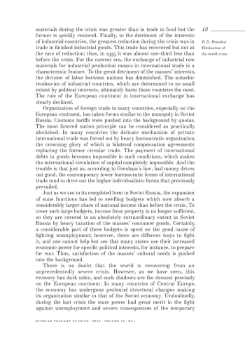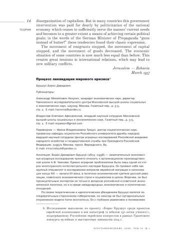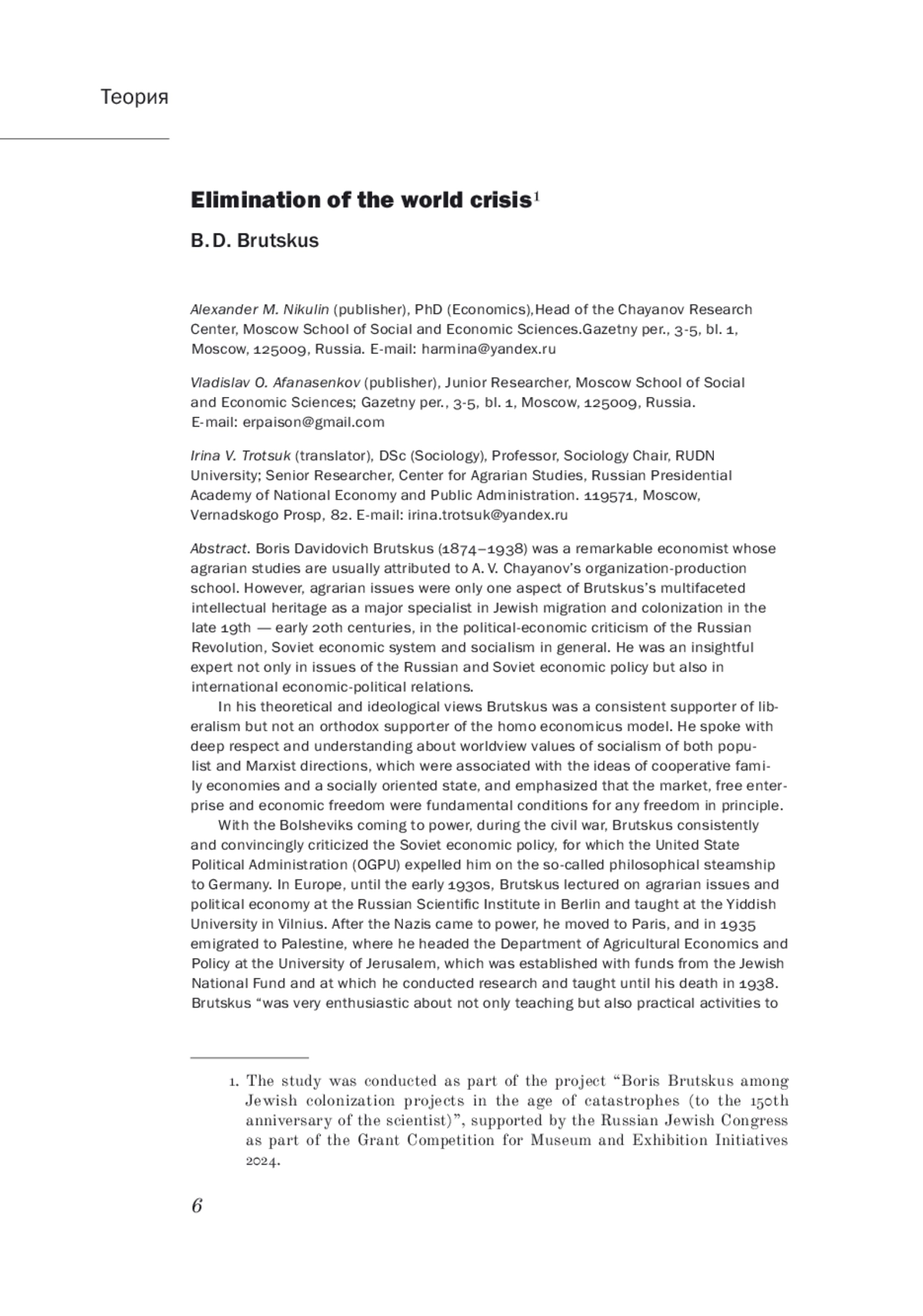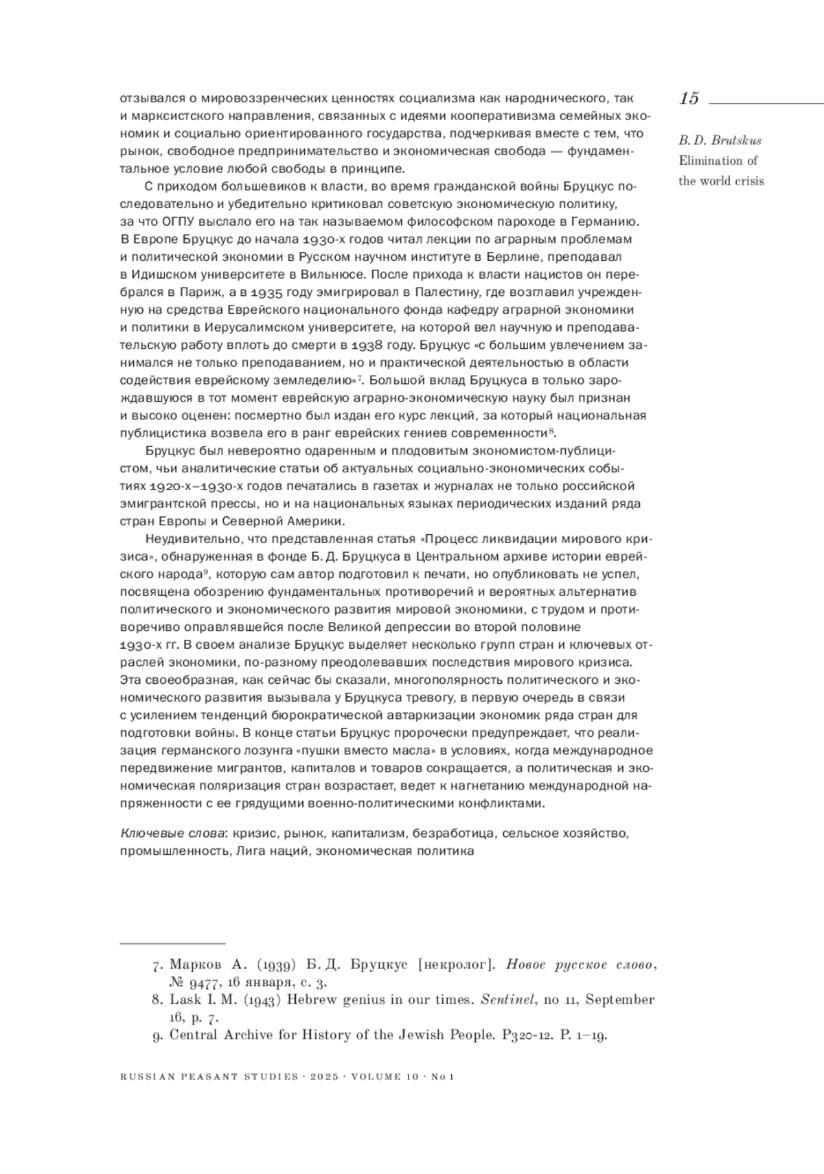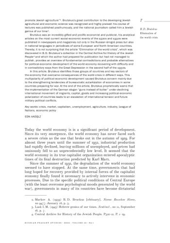 Boris Davidovich Brutskus (1874-1938) was a remarkable economist whose agrarian studies are usually attributed to A. V. Chayanov’s organization-production school. However, agrarian issues were only one aspect of Brutskus’s multifaceted intellectual heritage as a major specialist in Jewish migration and colonization in the late 19th - early 20th centuries, in the political-economic criticism of the Russian Revolution, Soviet economic system and socialism in general. He was an insightful expert not only in issues of the Russian and Soviet economic policy but also in international economic-political relations. In his theoretical and ideological views Brutskus was a consistent supporter of liberalism but not an orthodox supporter of the homo economicus model. He spoke with deep respect and understanding about worldview values of socialism of both populist and Marxist directions, which were associated with the ideas of cooperative family economies and a socially oriented state, and emphasized that the market, free enterprise and economic freedom were fundamental conditions for any freedom in principle. With the Bolsheviks coming to power, during the civil war, Brutskus consistently and convincingly criticized the Soviet economic policy, for which the United State Political Administration (OGPU) expelled him on the so-called philosophical steamship to Germany. In Europe, until the early 1930s, Brutskus lectured on agrarian issues and political economy at the Russian Scientific Institute in Berlin and taught at the Yiddish University in Vilnius. After the Nazis came to power, he moved to Paris, and in 1935 emigrated to Palestine, where he headed the Department of Agricultural Economics and Policy at the University of Jerusalem, which was established with funds from the Jewish National Fund and at which he conducted research and taught until his death in 1938. Brutskus “was very enthusiastic about not only teaching but also practical activities to promote Jewish agriculture”. Brutskus’s great contribution to the developing Jewish agricultural and economic science was recognized and highly praised: his course of lectures was published posthumously, and the national journalism called him a Jewish genius of our time. Brutskus was an incredibly gifted and prolific economist and publicist, his analytical articles on the most current social-economic events of the 1920s and 1930s were published in newspapers and magazines not only in the Russian émigré press but also in national languages in periodicals of some European and North American countries. Thereby, it is not surprising that the article “Elimination of the world crisis”, which was discovered in B. D. Brutskus’s collection in the Central Archive for History of the Jewish People and which the author had prepared for publication but had not managed to publish, provides an overview of fundamental contradictions and probable alternatives for political-economic development of the world economy recovering with difficulty and in contradictory ways from the Great Depression in the second half of the 1930s. In this article, Brutskus identifies those groups of countries and key sectors of the economy that overcame consequences of the world crisis in different ways. This multipolarity of political-economic development caused Brutskus concern mainly due to the strengthening tendencies of bureaucratic autarkization of economies in some countries preparing for war. At the end of the article, Brutskus prophetically warns that the implementation of the German slogan “guns instead of butter” under declining international movement of migrants, capital, goods and increasing political-economic polarization of countries leads to an escalation of international tension and future military-political conflicts.