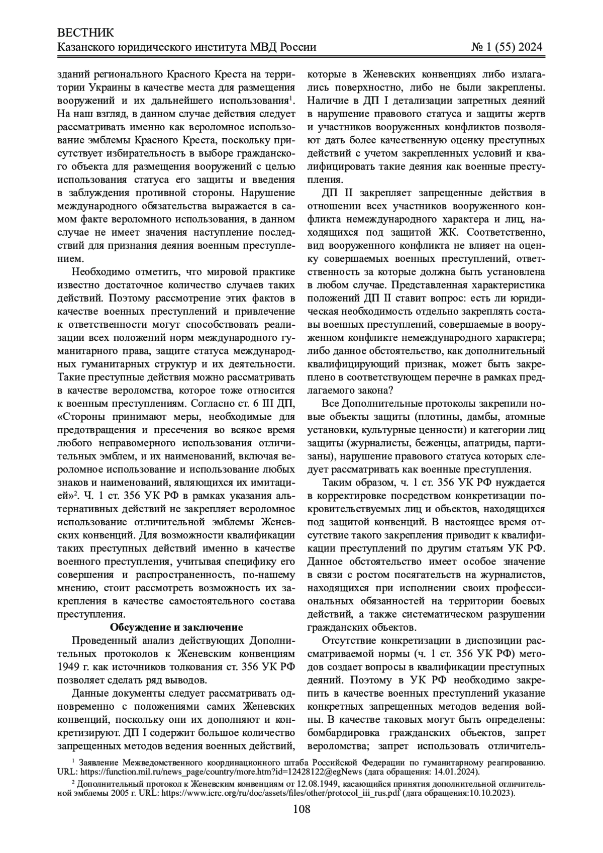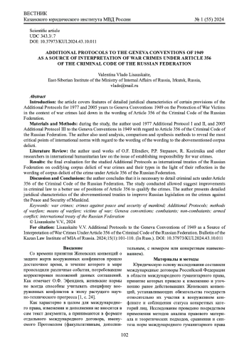 Результаты исследования: результатом работы стала итоговая оценка проанализированных Дополнительных протоколов как международных договоров РФ относительно закрепления военных преступлений и их видов в контексте их отражения в диспозиции состава преступления, предусмотренного ст. 356 УК РФ.