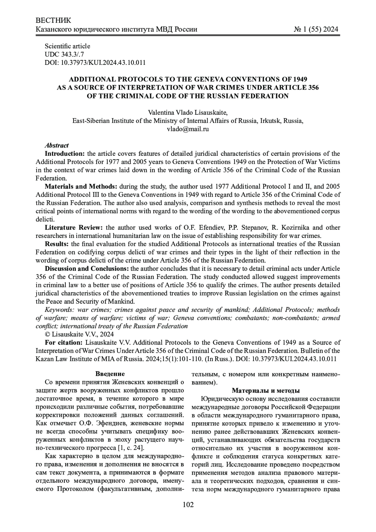 3. Прадун Д.С. Механизм обеспечения выполнения Россией обязательства, вытекающего из статьи 36 Дополнительного протокола I 1977 г. к Женевским конвенциям 1949 г. // Российское право онлайн. 2017. № 3. С. 66 - 76. EDN: ZRQFGF
