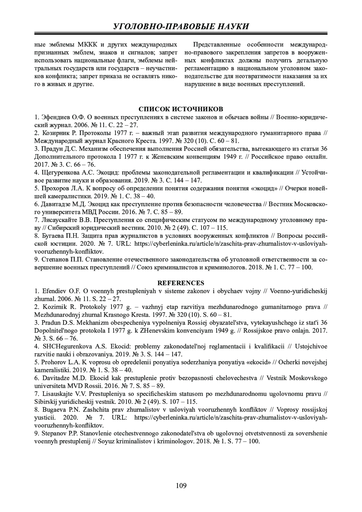 9. Степанов П.П. Становление отечественного законодательства об уголовной ответственности за совершение военных преступлений // Союз криминалистов и криминологов. 2018. № 1. С. 77 - 100. EDN: YLLMHZ