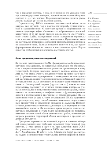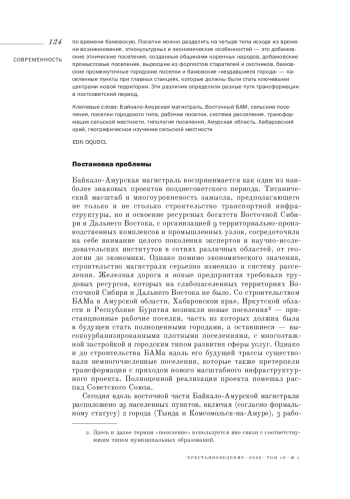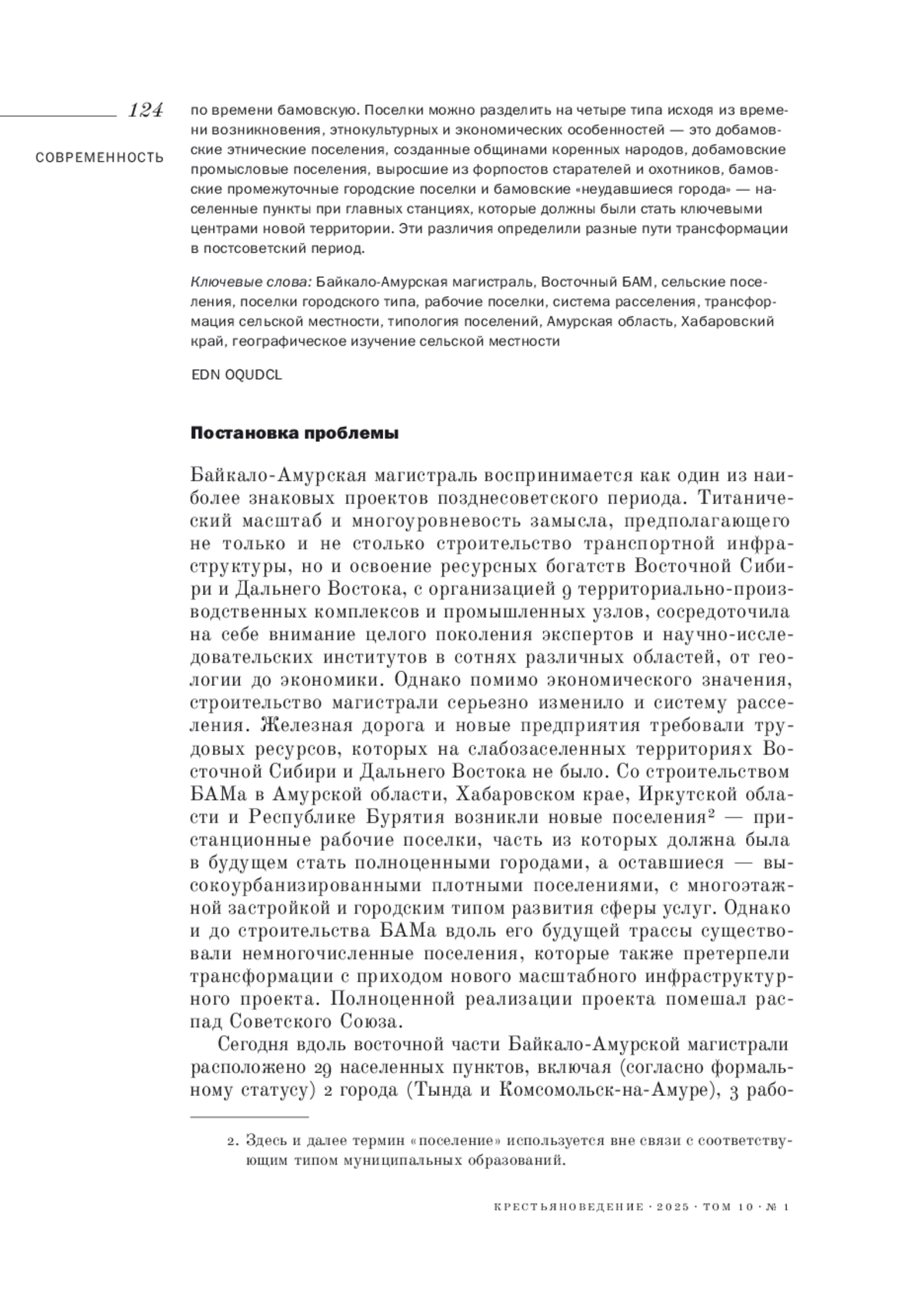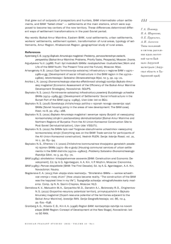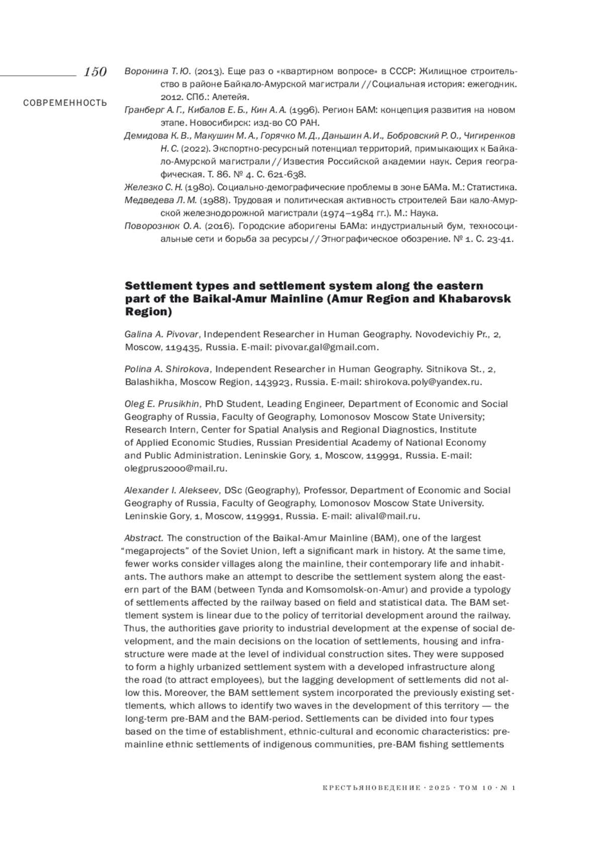 The construction of the Baikal-Amur Mainline (BAM), one of the largest “megaprojects” of the Soviet Union, left a significant mark in history. At the same time, fewer works consider villages along the mainline, their contemporary life and inhabitants. The authors make an attempt to describe the settlement system along the eastern part of the BAM (between Tynda and Komsomolsk-on-Amur) and provide a typology of settlements affected by the railway based on field and statistical data. The BAM settlement system is linear due to the policy of territorial development around the railway. Thus, the authorities gave priority to industrial development at the expense of social development, and the main decisions on the location of settlements, housing and infrastructure were made at the level of individual construction sites. They were supposed to form a highly urbanized settlement system with a developed infrastructure along the road (to attract employees), but the lagging development of settlements did not allow this. Moreover, the BAM settlement system incorporated the previously existing settlements, which allows to identify two waves in the development of this territory - the long-term pre-BAM and the BAM-period. Settlements can be divided into four types based on the time of establishment, ethnic-cultural and economic characteristics: premainline ethnic settlements of indigenous communities, pre-BAM fishing settlements that grew out of outposts of prospectors and hunters, BAM intermediate urban settlements, and BAM “failed cities” - settlements at the main stations, which were supposed to become key centers of the new territory. These differences determined different ways of settlement transformations in the post-Soviet period.