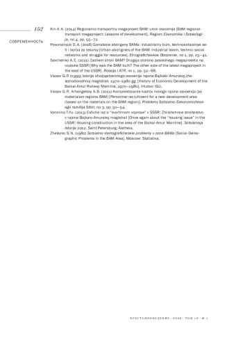 12. 	Воронина Т. Ю. (2013). Еще раз о “квартирном вопросе” в СССР: Жилищное строительство в районе Байкало-Амурской магистрали // Социальная история: ежегодник. 2012. СПб.: Алетейя.