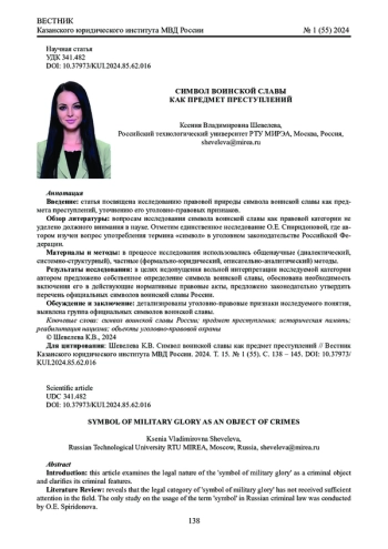 Введение: статья посвящена исследованию правовой природы символа воинской славы как предмета преступлений, уточнению его уголовно-правовых признаков.