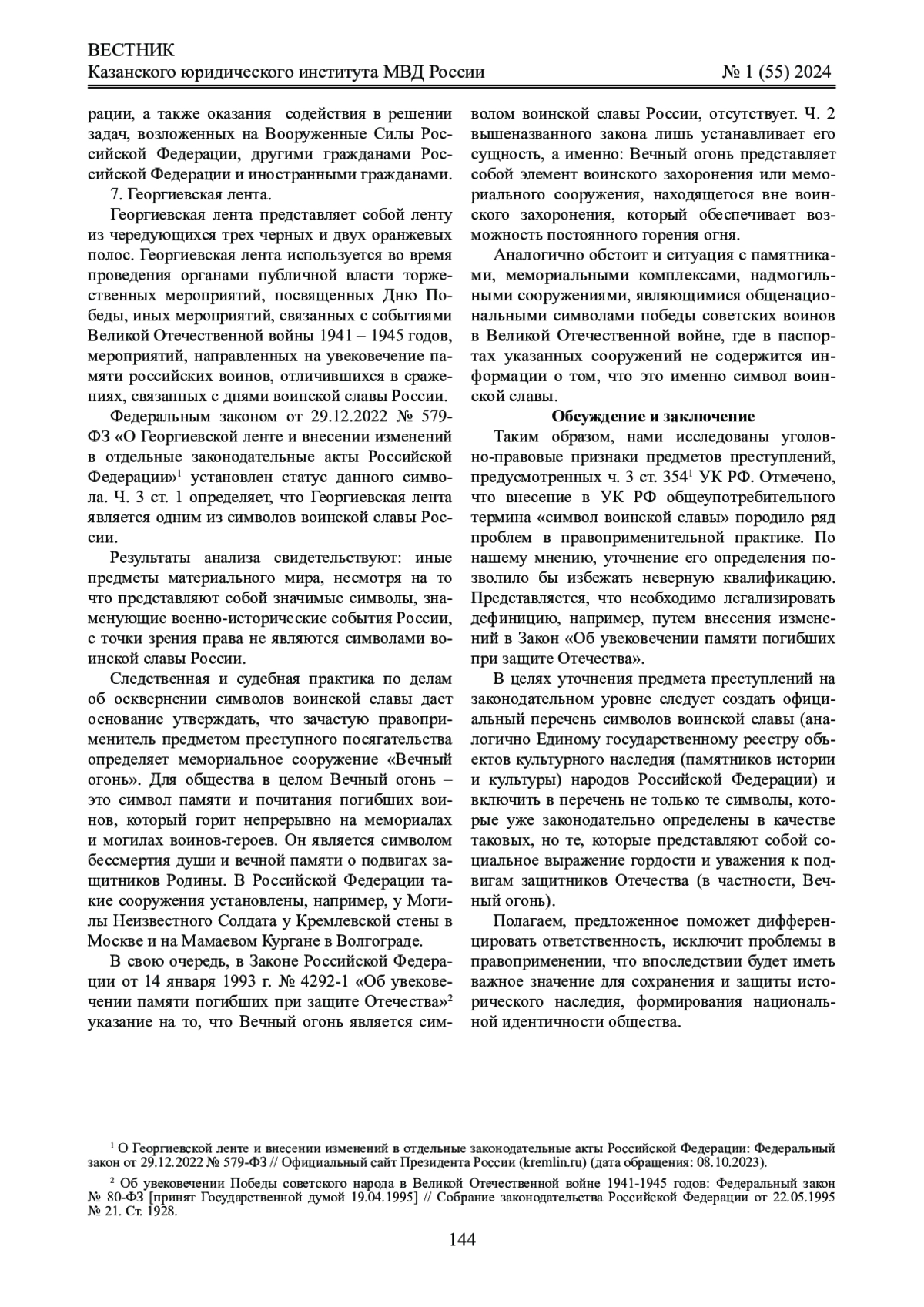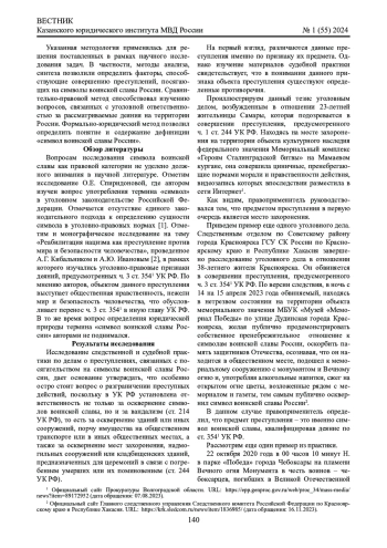 Обсуждение и заключение: детализированы уголовно-правовые признаки исследуемого понятия, выявлена группа официальных символов воинской славы.