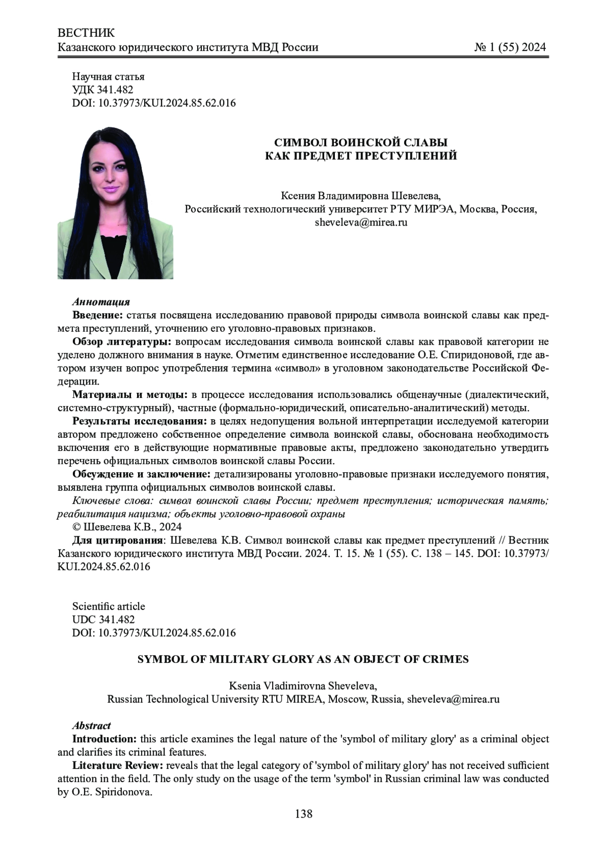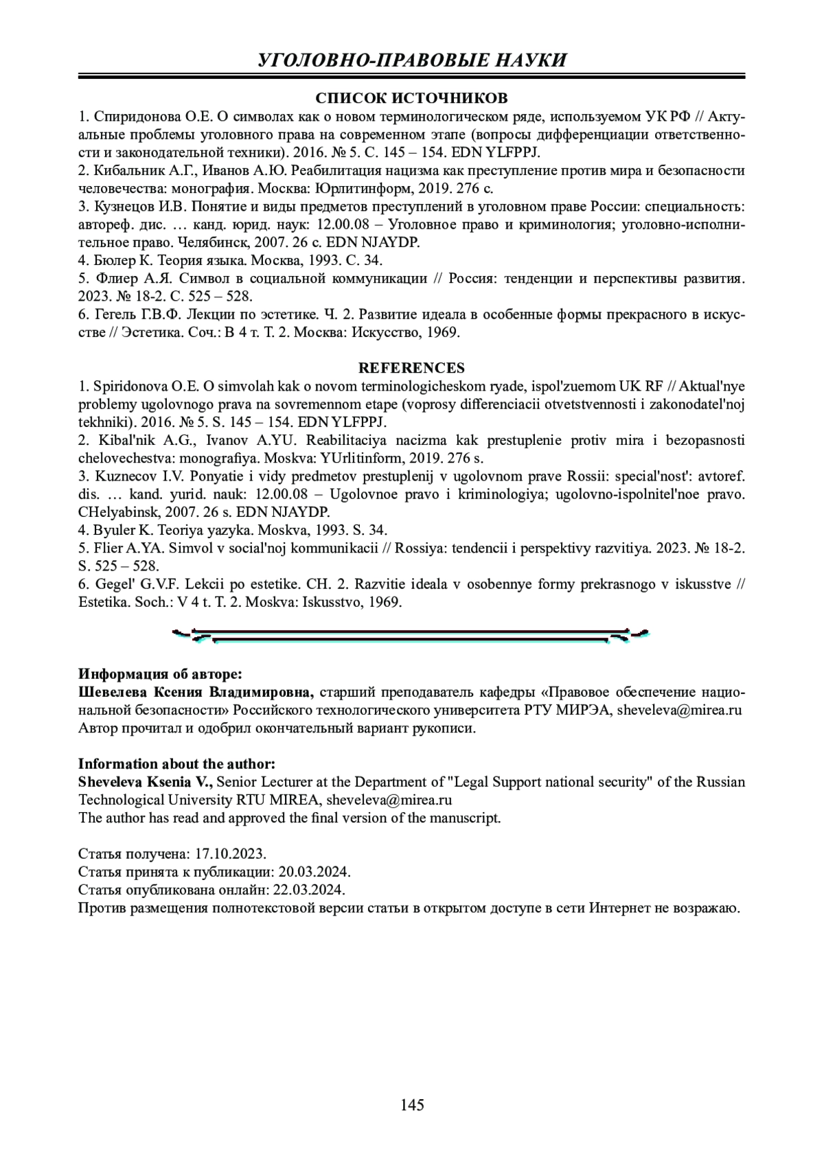 1. 	Спиридонова О.Е. О символах как о новом терминологическом ряде, используемом УК РФ // Актуальные проблемы уголовного права на современном этапе (вопросы дифференциации ответственности и законодательной техники). 2016. № 5. С. 145 - 154. EDN: YLFPPJ