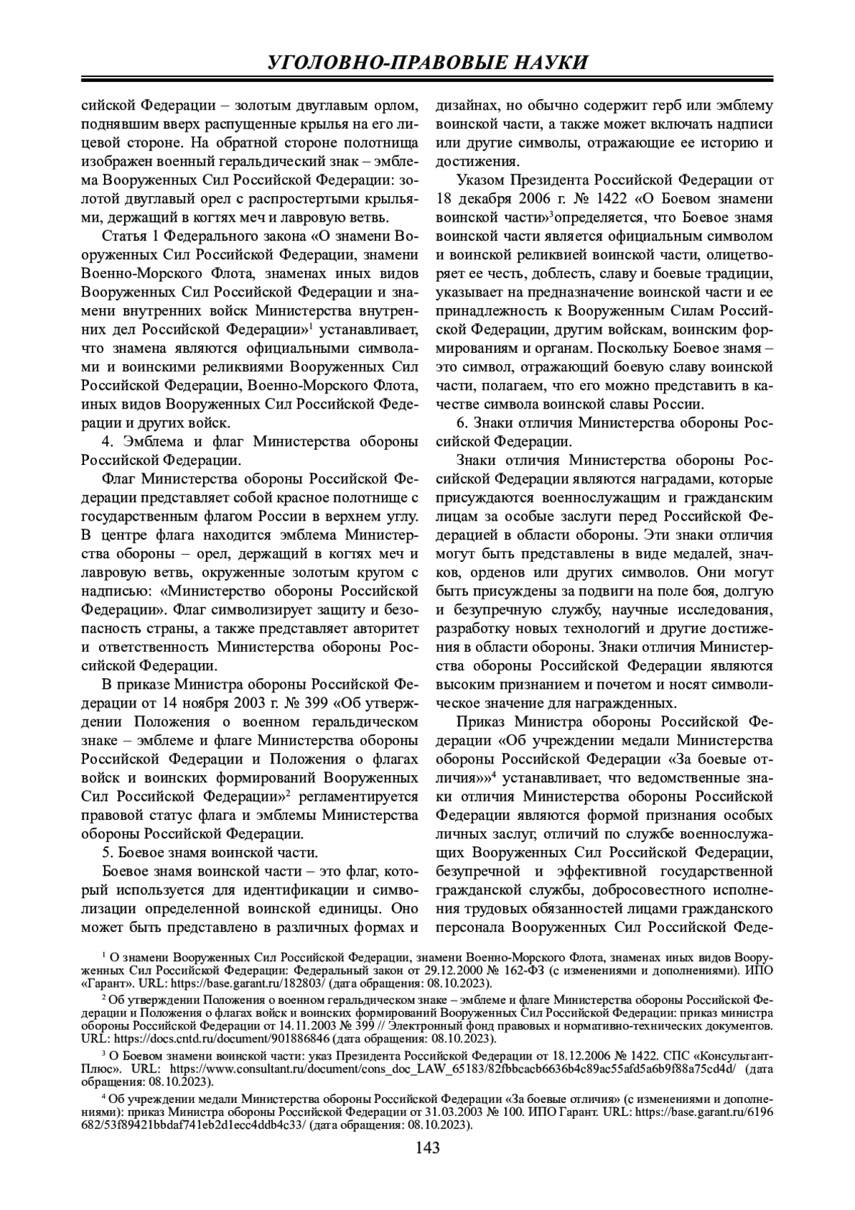 Результаты исследования: в целях недопущения вольной интерпретации исследуемой категории автором предложено собственное определение символа воинской славы, обоснована необходимость включения его в действующие нормативные правовые акты, предложено законодательно утвердить перечень официальных символов воинской славы России.