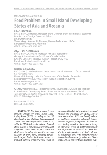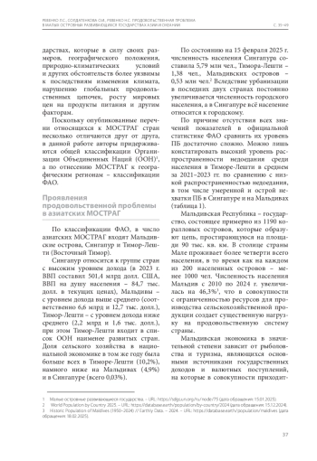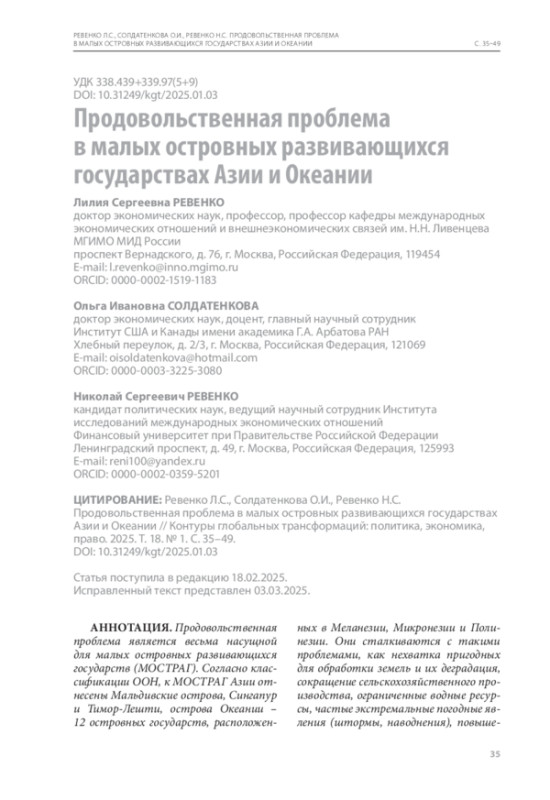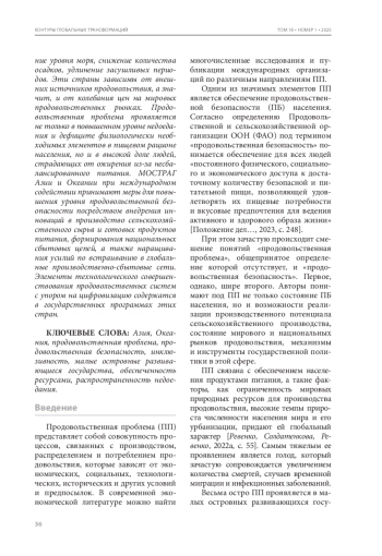 Продовольственная проблема является весьма насущной для малых островных развивающихся государств (МОСТРАГ). Согласно классификации ООН, к МОСТРАГ Азии отнесены Мальдивские острова, Сингапур и Тимор-Лешти, острова Океании – 12 островных государств, расположенных в Меланезии, Микронезии и Полинезии Они сталкиваются с такими проблемами, как нехватка пригодных для обработки земель и их деградация, сокращение сельскохозяйственного производства, ограниченные водные ресурсы, частые экстремальные погодные явления (штормы, наводнения), повышение уровня моря, снижение количества осадков, удлинение засушливых периодов. Эти страны зависимы от внешних источников продовольствия, а значит, и от колебания цен на мировых продовольственных рынках. Продовольственная проблема проявляется не только в повышенном уровне недоедания и дефиците физиологически необходимых элементов в пищевом рационе населения, но и в высокой доле людей, страдающих от ожирения из-за несбалансированного питания. МОСТРАГ Азии и Океании при международном содействии принимают меры для повышения уровня продовольственной безопасности посредством внедрения инноваций в производство сельскохозяйственного сырья и готовых продуктов питания, формирования национальных сбытовых цепей, а также наращивания усилий по встраиванию в глобальные производственно-сбытовые сети. Элементы технологического совершенствования продовольственных систем с упором на цифровизацию содержатся в государственных программах этих стран.