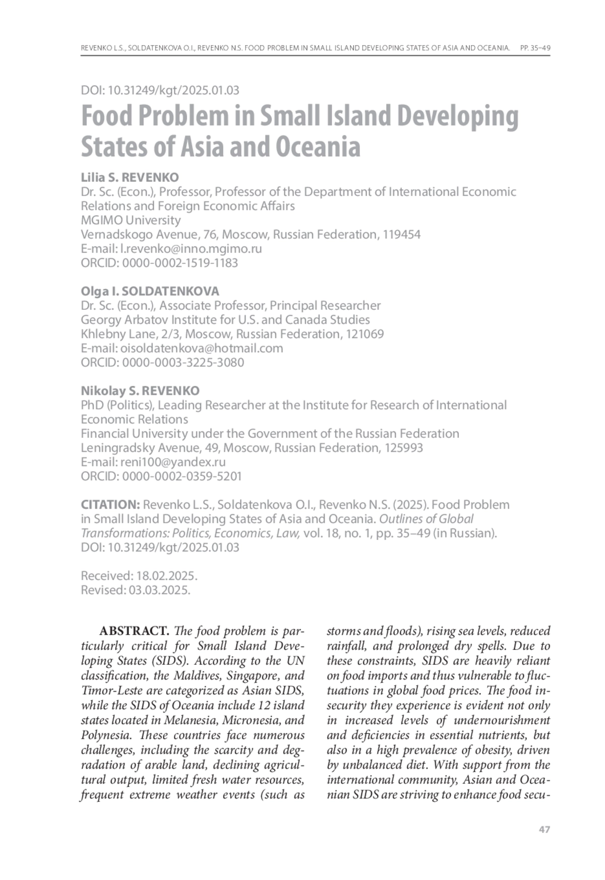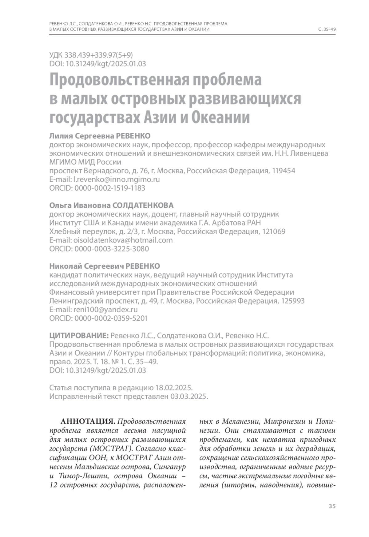 3. Ревенко Л.С., Солдатенкова О.И., Ревенко Н.С. Глобальная продовольственная проблема: новые вызовы для мира и России // Экономика. Налоги. Право. - 2022a. - Т. 15, № 4. - С. 54-65. - https://doi.org/10.26794/1999-849X‑2022-15-4-54-65.