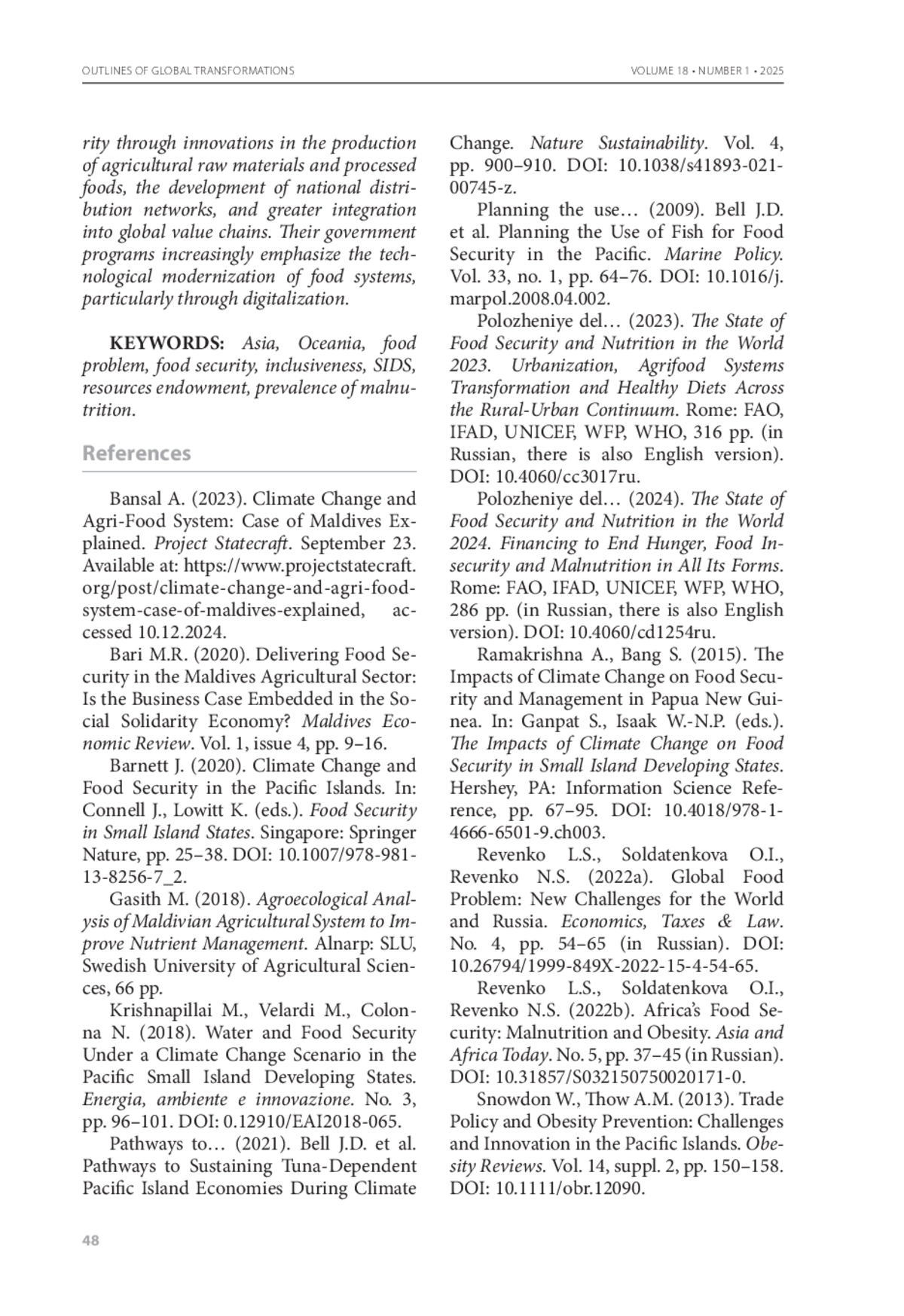 8. Barnett J. Climate Change and Food Security in the Pacific Islands // Food Security in Small Island States / Ed.by J. Connell, K. Lowitt. - Singapore : Springer Nature, 2020. - P. 25-38. - https://doi.org/10.1007/978-981-13-8256-7_2.
