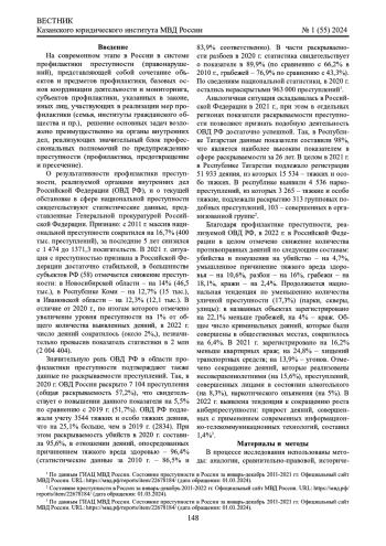 Материалы и методы: теоретическую основу исследования составили научные труды отечественных ученых, посвященные вопросам научного обеспечения правоохранительной деятельности, нормативные правовые акты, официальные данные МВД России. Методологической основой исследования выступили диалектический метод научного познания социальных явлений, позволивший отразить взаимосвязь теории и практики, а также формально-юридический, сравнительно-правовой и логико-юридический методы.