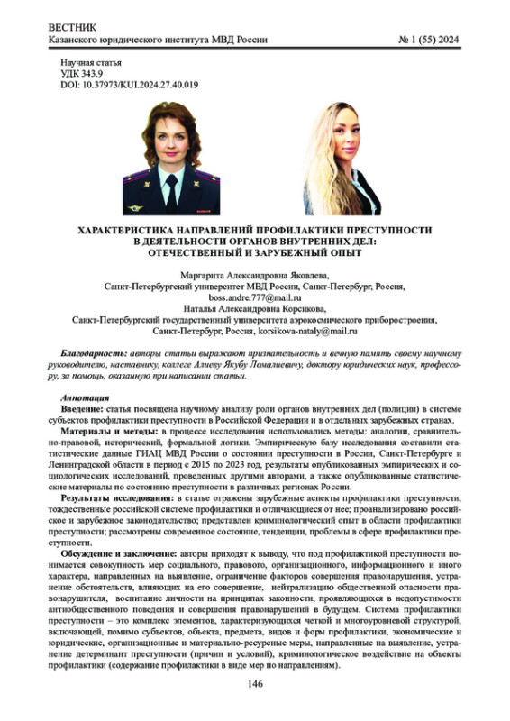 1. Шалагин А.Е., Идиятуллов А.Д. Зарубежный опыт предупреждения преступности в XXI веке // Вестник Казанского юридического института МВД России. 2020. № 2 (40). С.119-129. EDN: KWRFMW