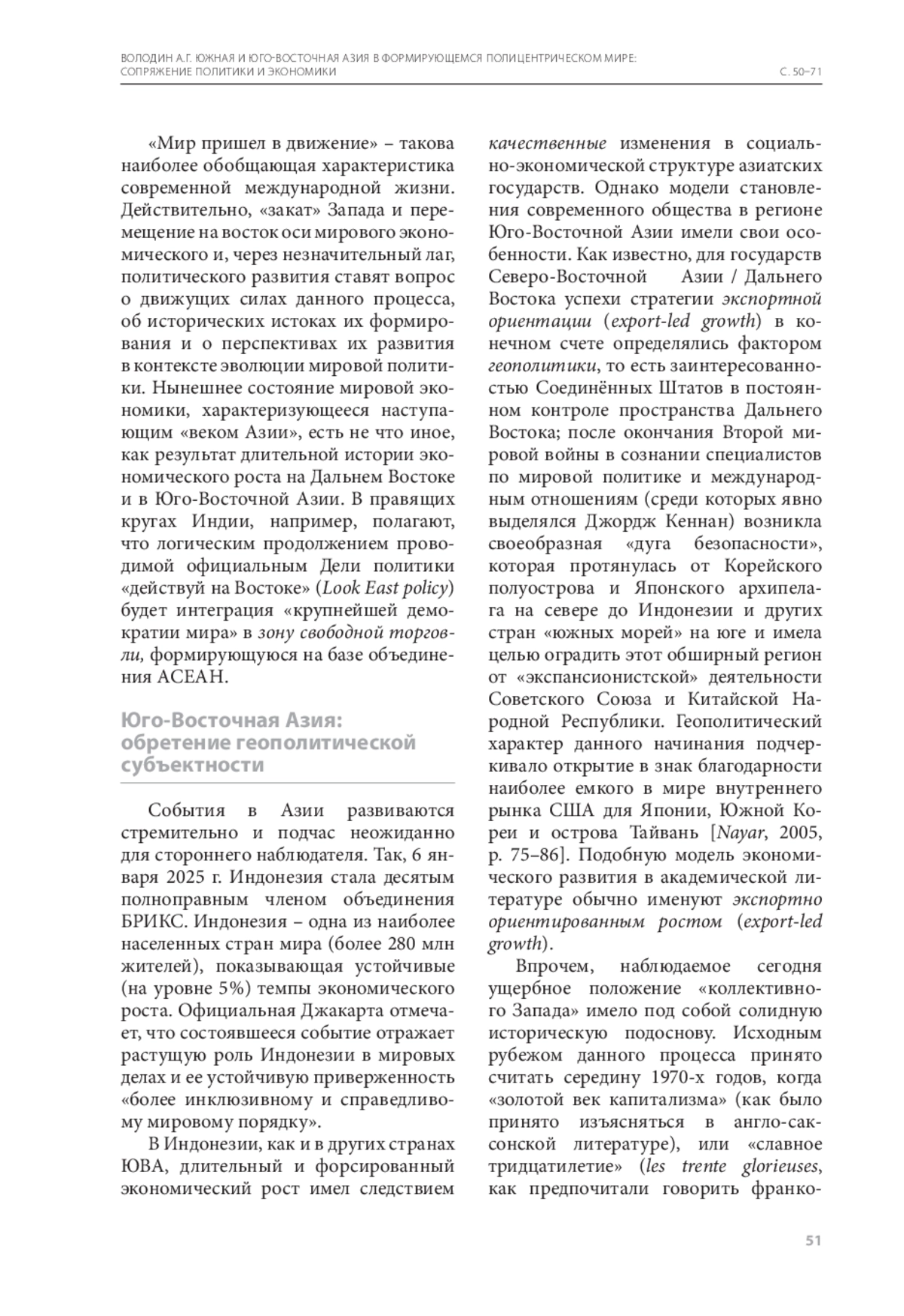 С января 2025 г. полноправным членом БРИКС стала Индонезия, две другие страны Юго-Восточной Азии (ЮВА), Малайзия и Таиланд, получили статус государств-партнеров этой организации. Что мотивировало их присоединиться к международному блоку, выражающему интересы Глобального Юга, и с какими рисками они могут столкнуться? Эти вопросы и стали предметом анализа в статье. При схожести позиций стран ЮВА в отношении БРИКС они тем не менее имеют страновые отличия, что побудило автора выделить Индонезию, Малайзию и Таиланд в отдельные кейсы. Это позволяет более детально изучить факторы и аргументы, лежащие в основе их решения по вхождению в блок развивающихся стран с надеждой на получение дополнительных экономических выгод от расширения сотрудничества с ними. Для них платформа многостороннего блока рассматривается как возможность увеличить число своих экономических партнеров и получить доступ на новые рынки, к новым инвестициям и технологиям. Но не менее важно для них геополитическое содержание блока с его устремлениями на трансформацию мирового порядка. Желание адаптироваться к меняющейся геополитической системе, чтобы не упустить возможность, побуждает страны ЮВА войти в состав БРИКС, что, по их мнению, обеспечивает двойную выгоду: сохранить стратегическую автономию и повысить свой вес в решении глобальных проблем. Подобная позиция в Индонезии и Малайзии формируется в немалой степени под влиянием личных амбиций их лидеров, стремящихся играть важную роль на международной арене и стать рупором развивающихся стран. Однако приобретенные в будущем выгоды от присоединения к БРИКС сопряжены с рядом рисков, к числу которых относится как возможность осложнения взаимоотношений с развитыми странами, в первую очередь США и странами Европейского союза, которые являются их важными торговыми партнерами и источниками инвестиций, так и рост сверхзависимости от Китая, что способно спровоцировать рост антикитайских настроений в обществе и сказаться на репутации Индонезии и Малайзии как неприсоединившихся стран, стремящихся хеджироваться между соперничающими между собой США и Китаем. По мнению автора, чтобы обеспечить долгосрочное экономическое процветание и геополитическую безопасность, страны ЮВА должны тщательно балансировать свои отношения в рамках БРИКС с отношениями за пределами блока.