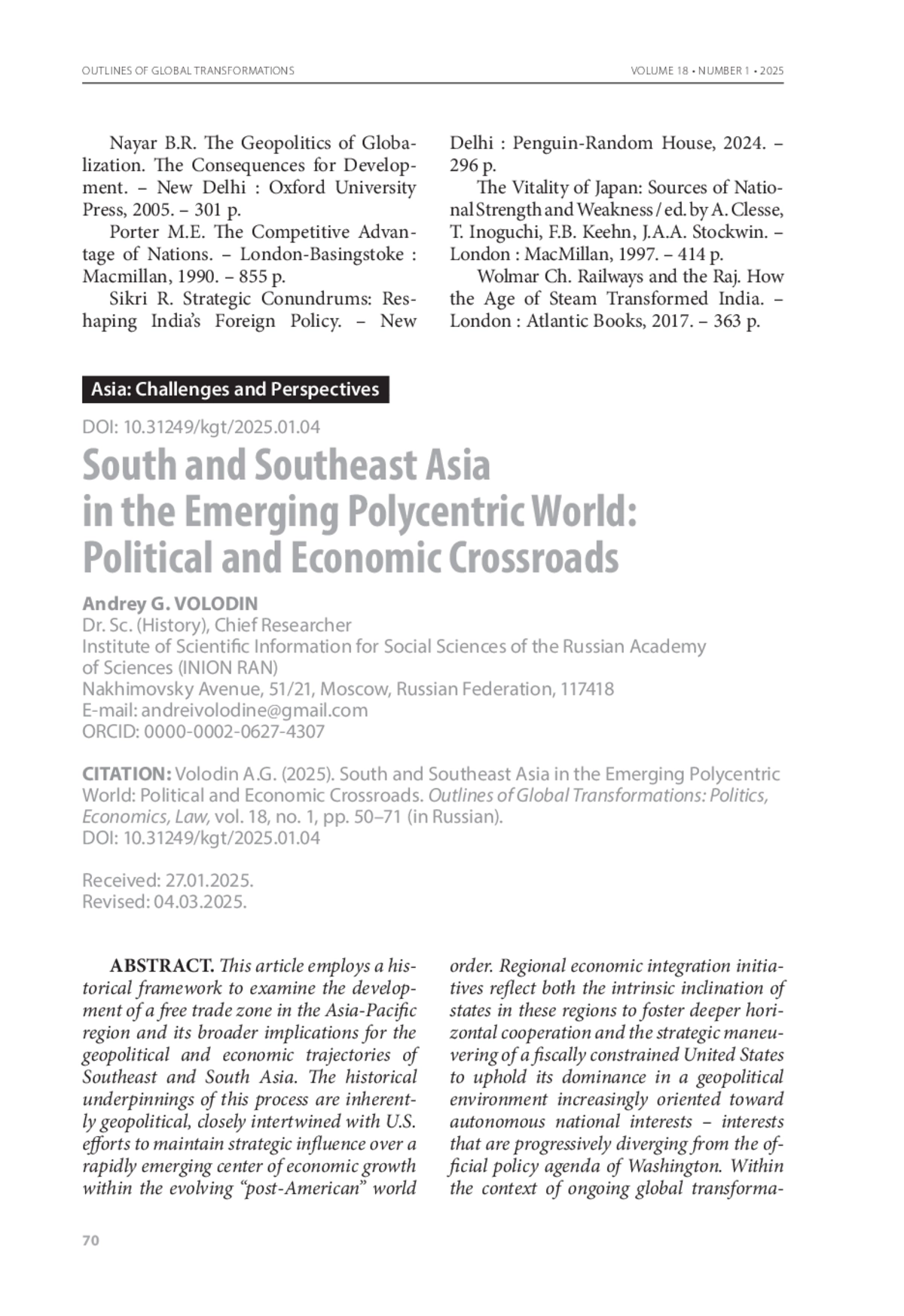 В статье в историческом плане рассматривается процесс развития зоны свободной торговли в Азиатско-Тихоокеанском регионе и его влияние на динамику эволюции регионов Юго-Восточной и Южной Азии. Исторические истоки данного процесса имеют геополитический характер и напрямую связаны с желанием США удержать под своим контролем обширный регион, который превратился в центр экономического роста и развития «постамериканского» мира. Проекты региональной экономической интеграции отражают, с одной стороны, естественное стремление стран двух регионов к более тесному горизонтальному взаимодействию и попытки неплатежеспособной американской экономики сохранить под своим контролем пространство, которое руководствуется своими национальными интересами, всё чаще расходящимися с политическими устремлениями официального Вашингтона, - с другой. В сложившихся условиях претерпевает изменения роль Индии в мировой и региональной политике. Предпринята попытка на фоне тектонических глобальных изменений оценить возможности укрепления российско-индийских отношений.
