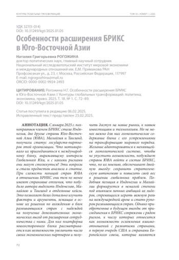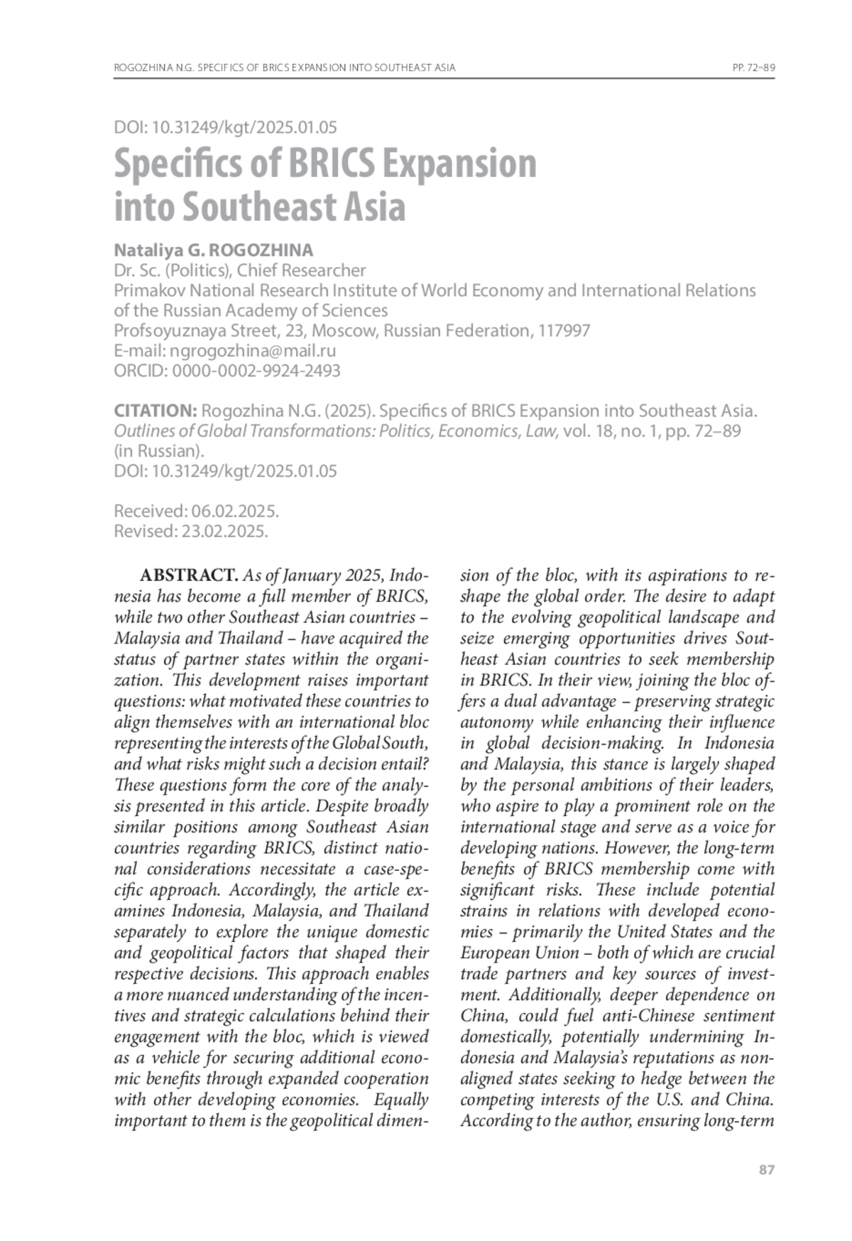С января 2025 г. полноправным членом БРИКС стала Индонезия, две другие страны Юго-Восточной Азии (ЮВА), Малайзия и Таиланд, получили статус государств-партнеров этой организации. Что мотивировало их присоединиться к международному блоку, выражающему интересы Глобального Юга, и с какими рисками они могут столкнуться? Эти вопросы и стали предметом анализа в статье. При схожести позиций стран ЮВА в отношении БРИКС они тем не менее имеют страновые отличия, что побудило автора выделить Индонезию, Малайзию и Таиланд в отдельные кейсы. Это позволяет более детально изучить факторы и аргументы, лежащие в основе их решения по вхождению в блок развивающихся стран с надеждой на получение дополнительных экономических выгод от расширения сотрудничества с ними. Для них платформа многостороннего блока рассматривается как возможность увеличить число своих экономических партнеров и получить доступ на новые рынки, к новым инвестициям и технологиям. Но не менее важно для них геополитическое содержание блока с его устремлениями на трансформацию мирового порядка. Желание адаптироваться к меняющейся геополитической системе, чтобы не упустить возможность, побуждает страны ЮВА войти в состав БРИКС, что, по их мнению, обеспечивает двойную выгоду: сохранить стратегическую автономию и повысить свой вес в решении глобальных проблем. Подобная позиция в Индонезии и Малайзии формируется в немалой степени под влиянием личных амбиций их лидеров, стремящихся играть важную роль на международной арене и стать рупором развивающихся стран. Однако приобретенные в будущем выгоды от присоединения к БРИКС сопряжены с рядом рисков, к числу которых относится как возможность осложнения взаимоотношений с развитыми странами, в первую очередь США и странами Европейского союза, которые являются их важными торговыми партнерами и источниками инвестиций, так и рост сверхзависимости от Китая, что способно спровоцировать рост антикитайских настроений в обществе и сказаться на репутации Индонезии и Малайзии как неприсоединившихся стран, стремящихся хеджироваться между соперничающими между собой США и Китаем. По мнению автора, чтобы обеспечить долгосрочное экономическое процветание и геополитическую безопасность, страны ЮВА должны тщательно балансировать свои отношения в рамках БРИКС с отношениями за пределами блока.