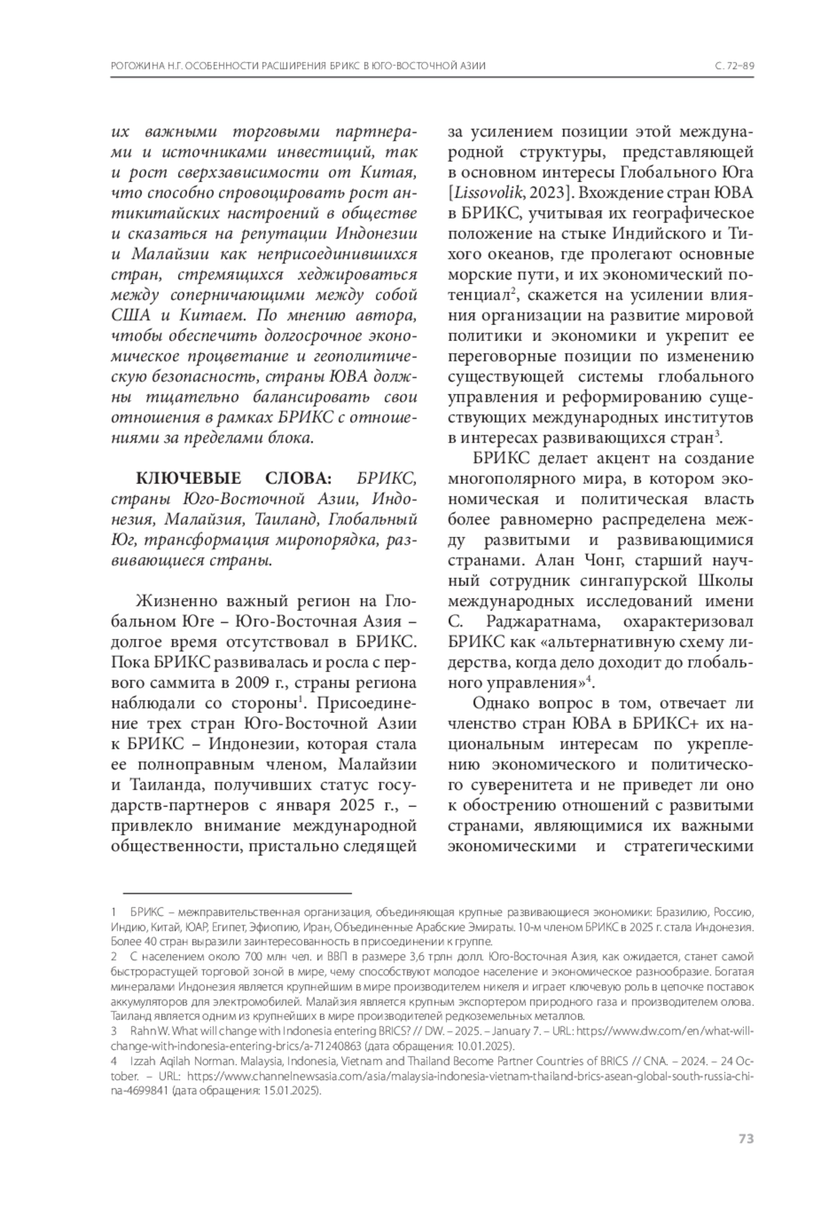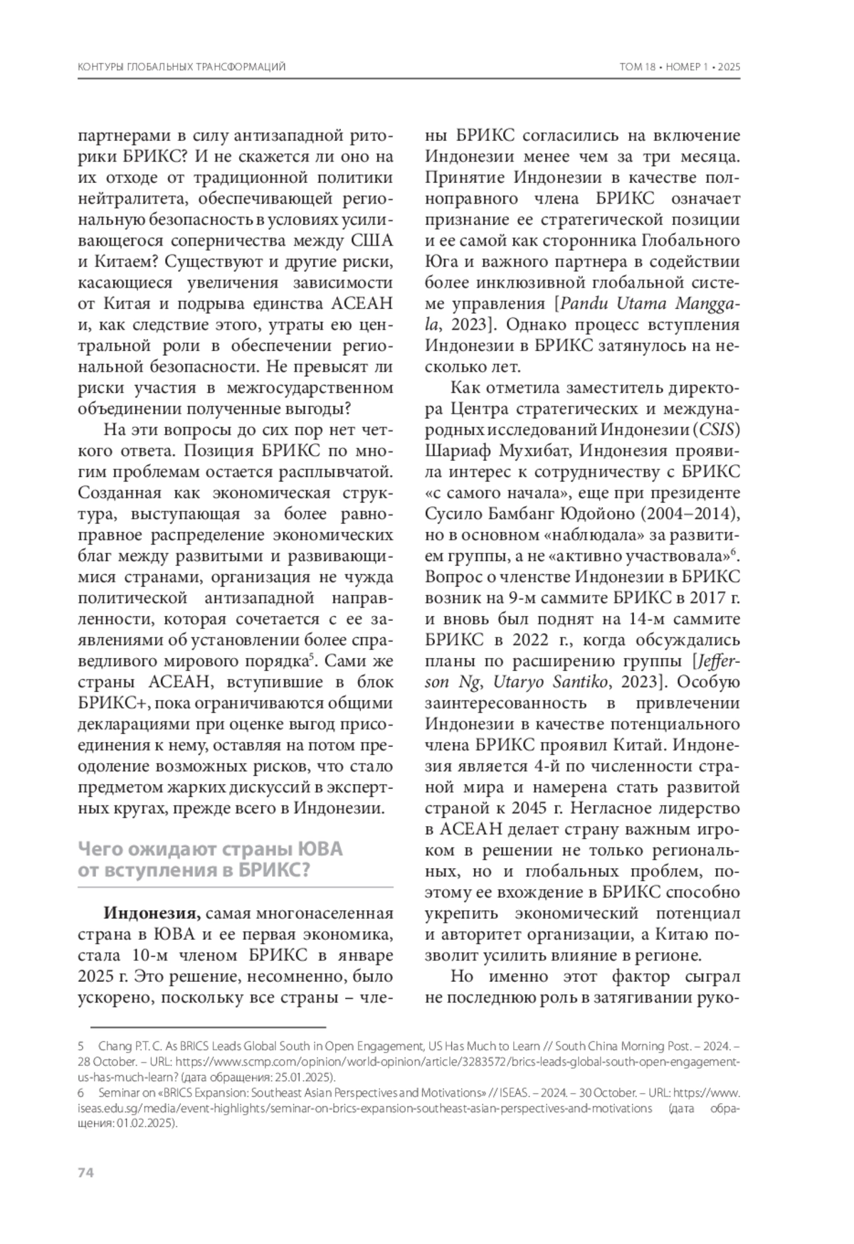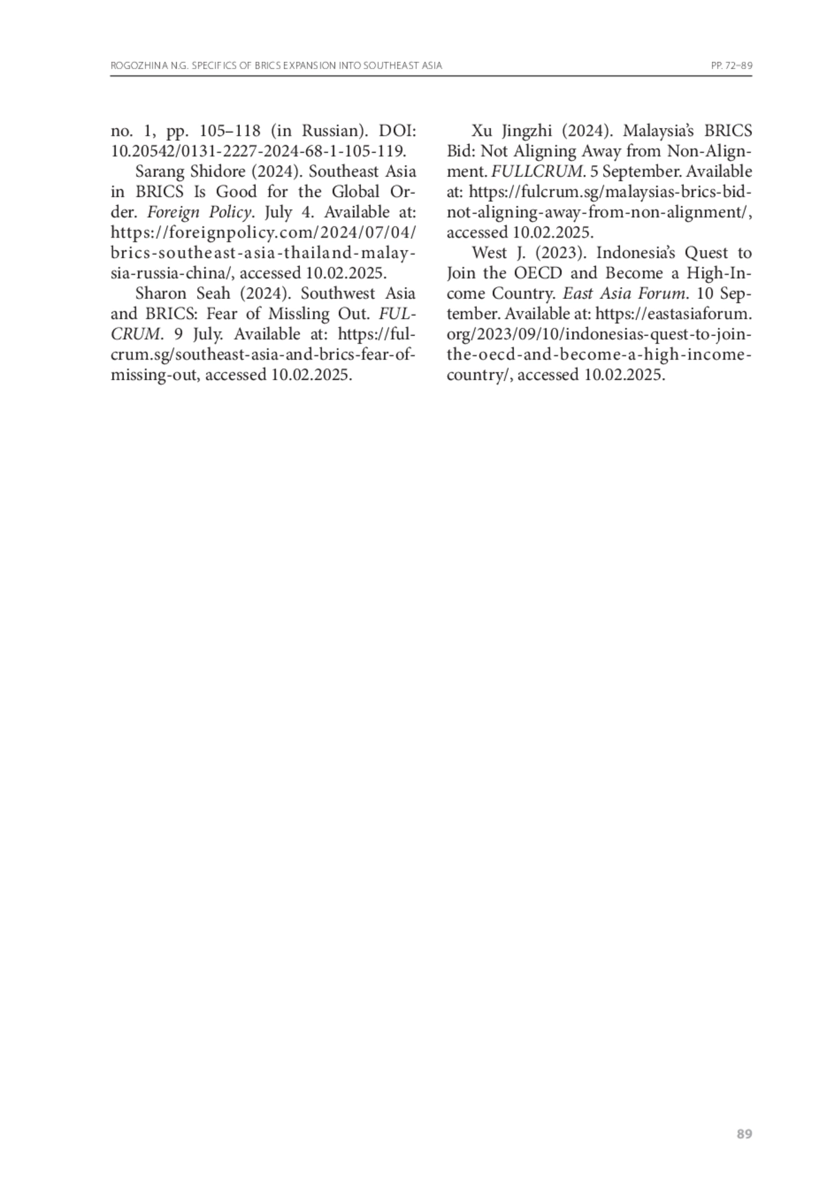16. Sharon Seah. Southwest Asia and BRICS: Fear of Missing Out // FULCRUM. - 2024. - July 9. - URL: https://fulcrum.sg/southeast-asia-and-brics-fear-of-missing-out (дата обращения: 10.02.2025).