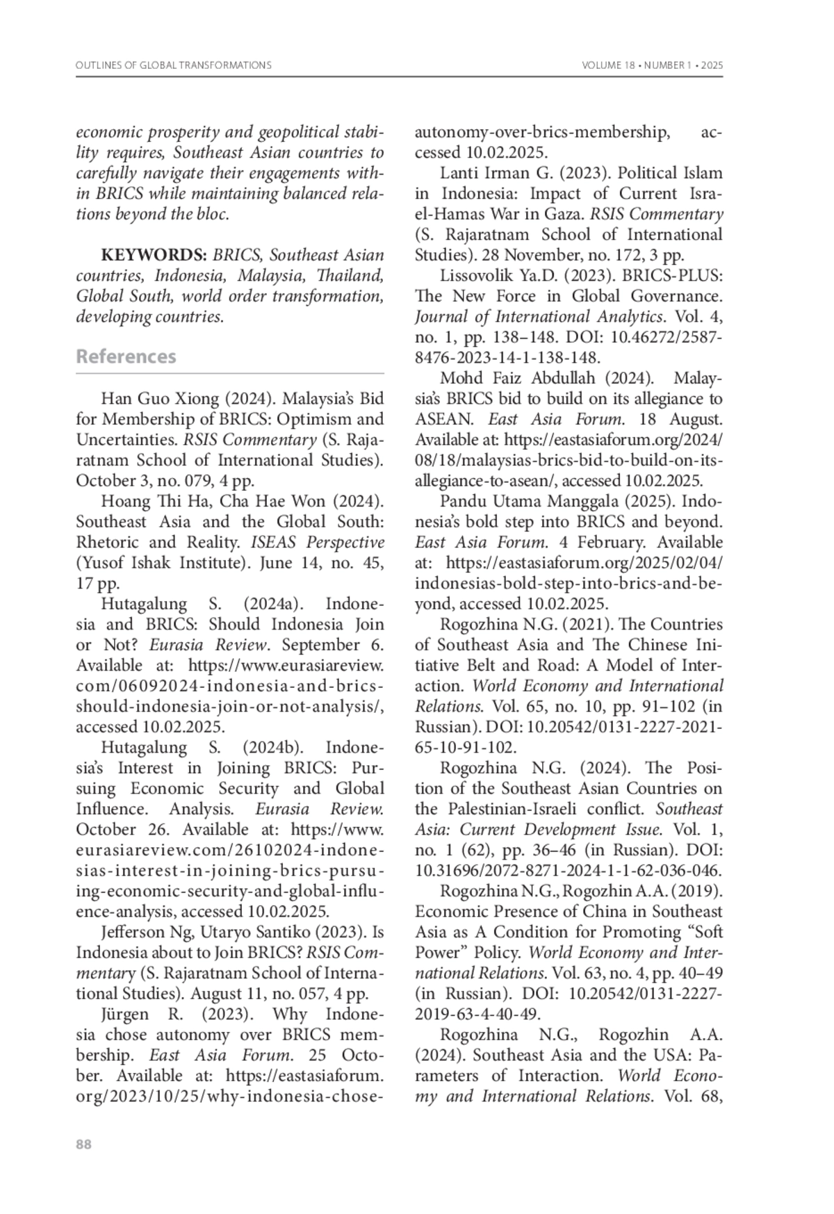 8. Hutagalung S. Indonesia’s Interest in Joining BRICS: Pursuing Economic Security and Global Influence. Analysis // Eurasia Review. - 2024b. - October 26. - URL: https://www.eurasiareview.com/26102024-indonesias-interest-in-joining-brics-pursuing-economic-security-and-global-influence-analysis (дата обращения: 10.02.2025).