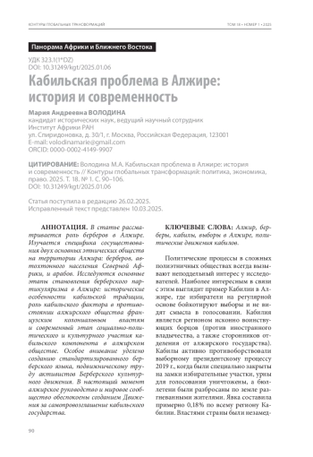 В статье рассматривается роль берберов в Алжире. Изучается специфика сосуществования двух основных этнических обществ на территории Алжира: берберов, автохтонного населения Северной Африки, и арабов. Исследуются основные этапы становления берберского партикуляризма в Алжире: исторические особенности кабильской традиции, роль кабильского фактора в противостоянии алжирского общества французским колониальным властям и современный этап социально-политического и культурного участия кабильского компонента в алжирском обществе. Особое внимание уделено созданию стандартизированного берберского языка, подвижническому труду активистов Берберского культурного движения. В настоящий момент алжирское руководство и мировое сообщество обеспокоены созданием Движения за самопровозглашение кабильского государства.
