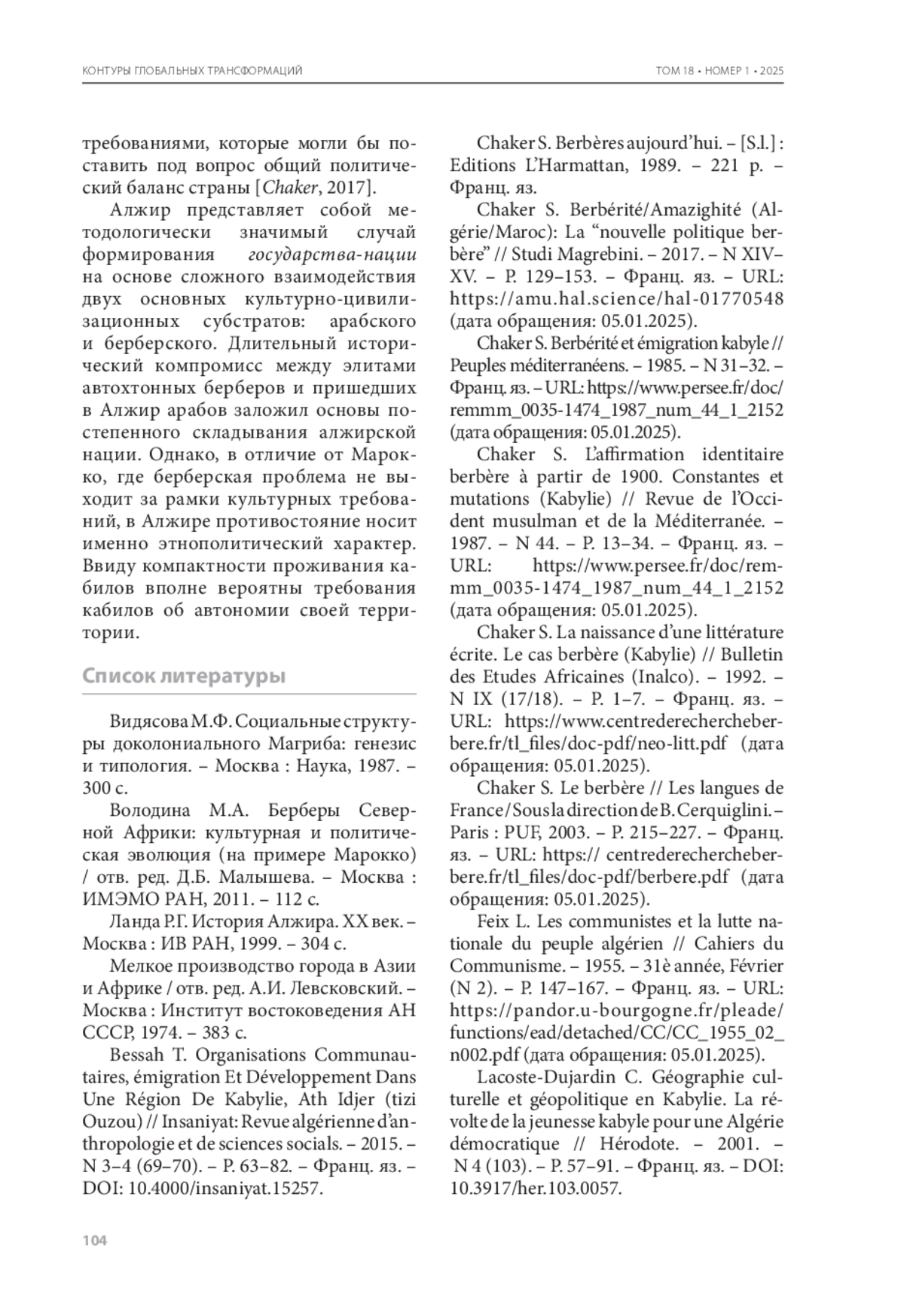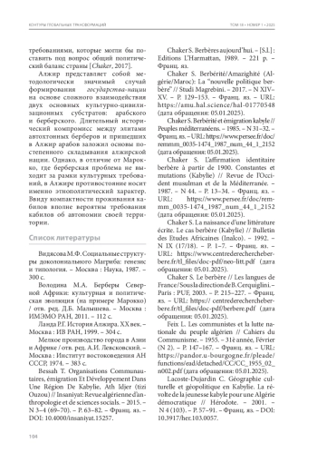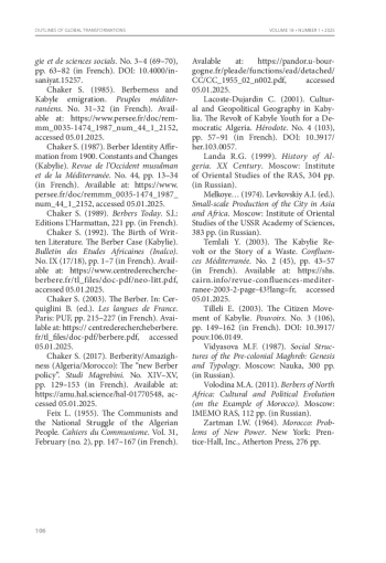 9. Chaker S. L’affirmation identitaire berbère à partir de 1900. Constantes et mutations (Kabylie) // Revue de l’Occident musulman et de la Méditerranée. - 1987. - N 44. - P. 13-34. - Франц. яз. - URL: https://www.persee.fr/doc/rem-mm_0035-1474_1987_num_44_1_2152 (дата обращения: 05.01.2025).