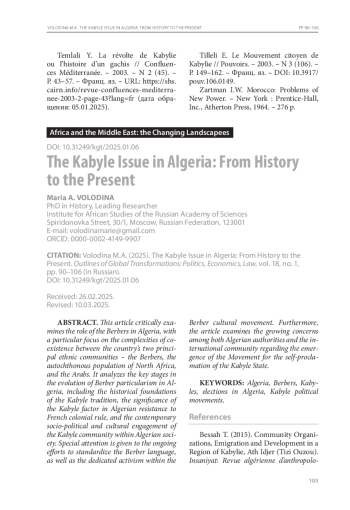 14. Temlali Y. La révolte de Kabylie ou l’histoire d’un gachis // Confluences Méditerranée. - 2003. - N 2 (45). - P. 43-57. - Франц. яз. - URL: https://shs.cairn.info/revue-confluences-mediterranee-2003-2-page-43?lang=fr (дата обращения: 05.01.2025).