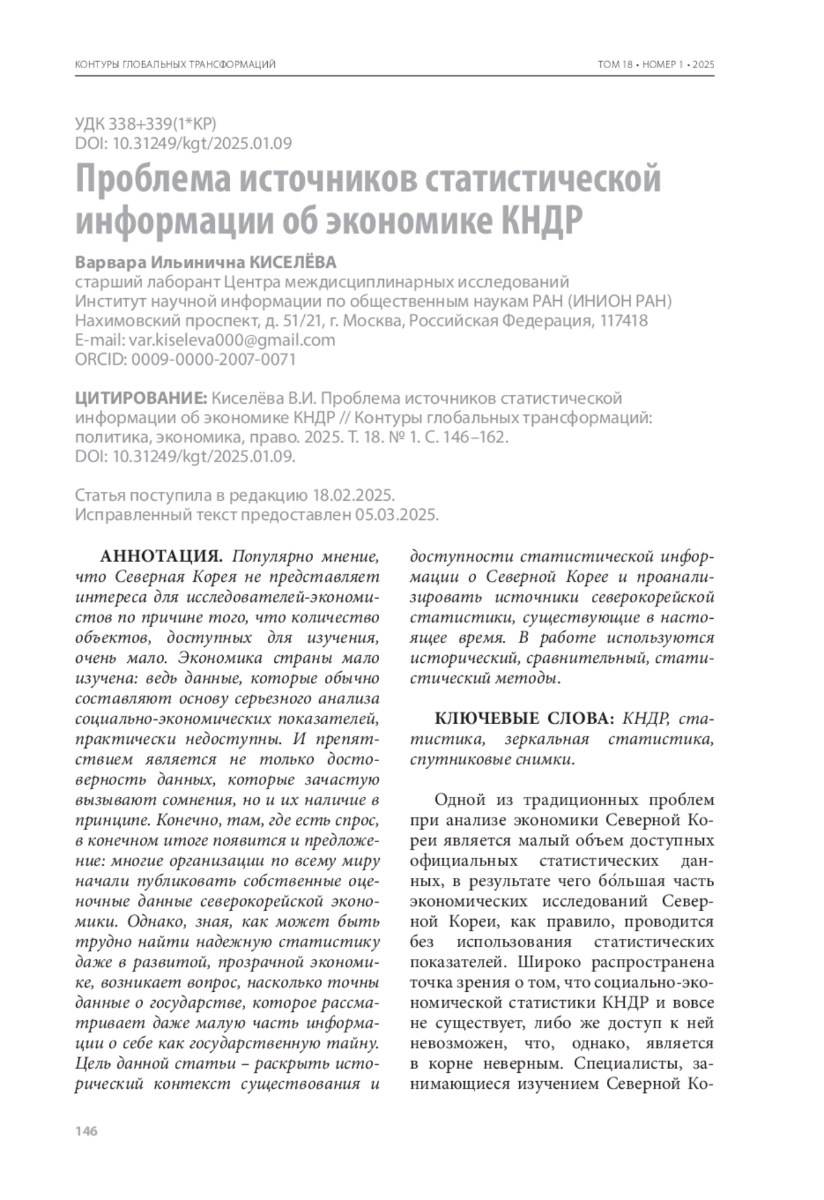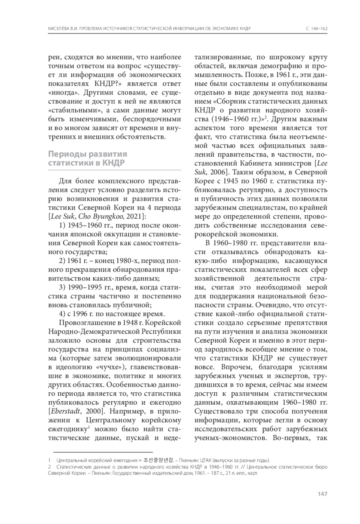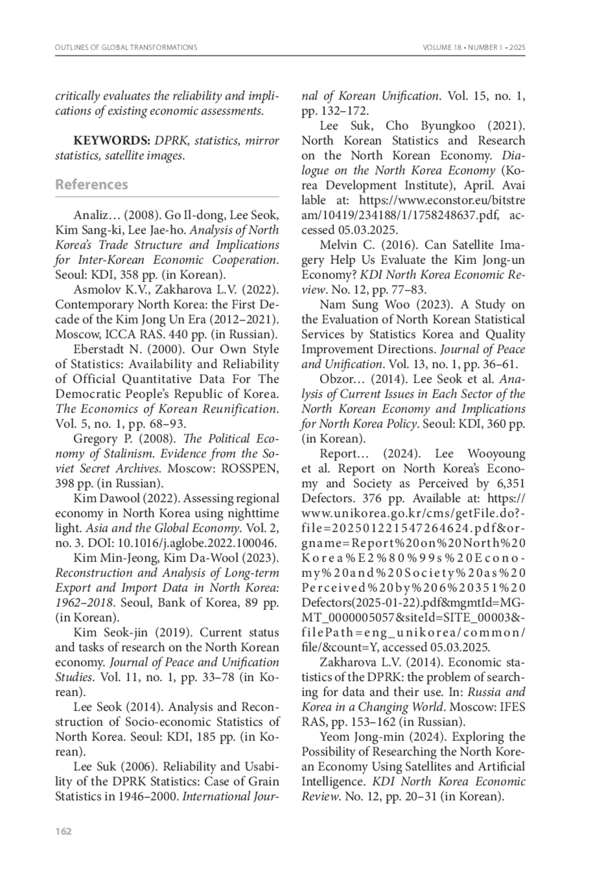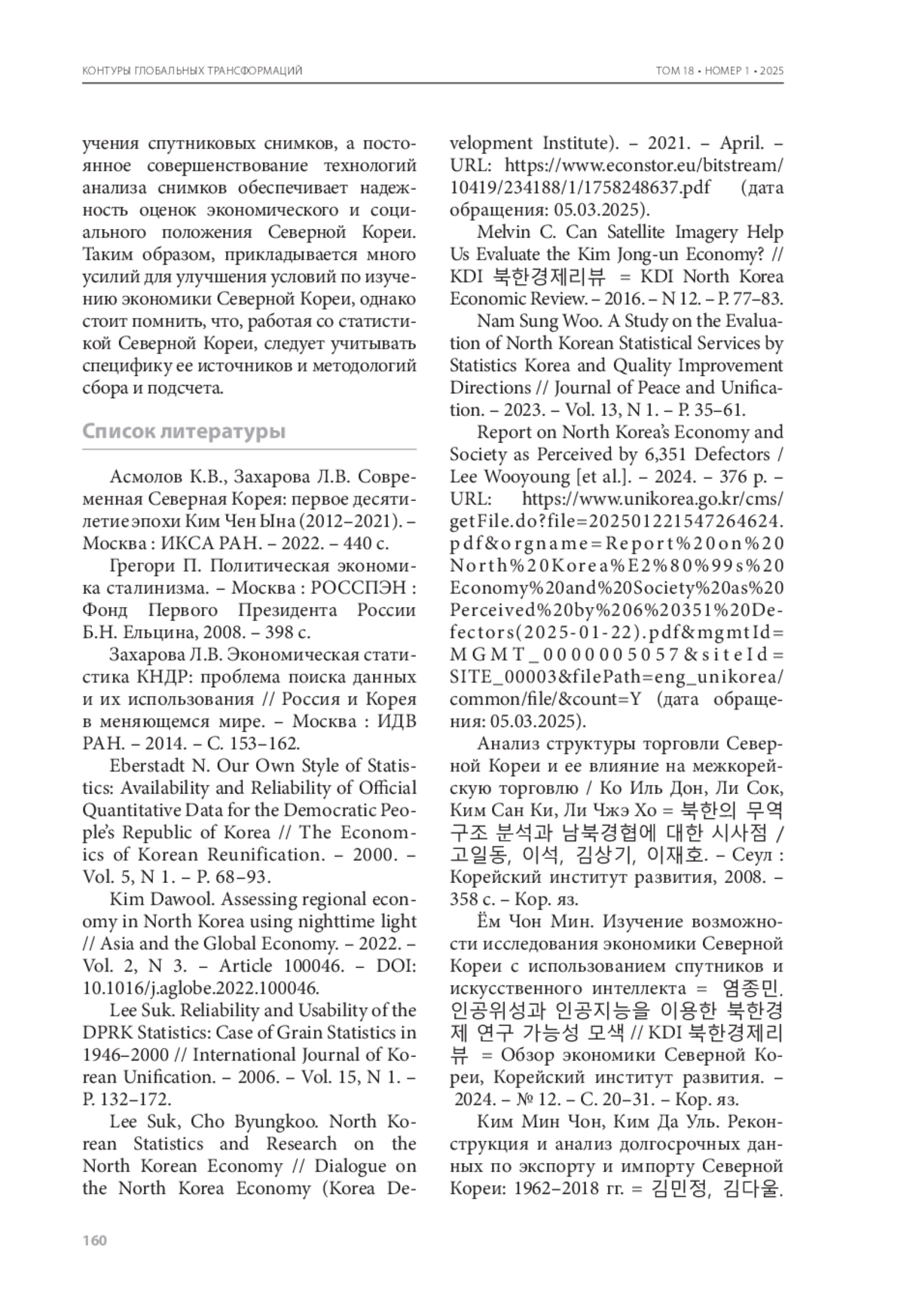 7. Lee Suk, Cho Byungkoo. North Korean Statistics and Research on the North Korean Economy // Dialogue on the North Korea Economy (Korea Development Institute). - 2021. - April. - URL: https://www.econstor.eu/bitstream/10419/234188/1/1758248637.pdf (дата обращения: 05.03.2025).