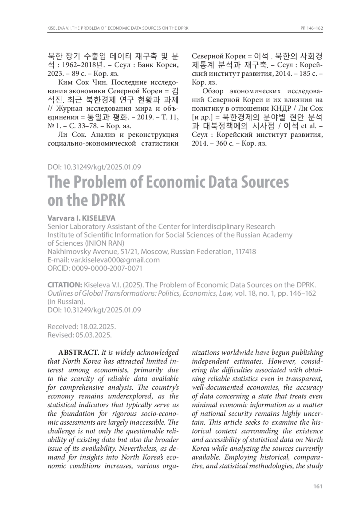 14. Ким Сок Чин. Последние исследования экономики Северной Кореи = 김 석진. 최근 북한경제 연구 현황과 과제 // Журнал исследования мира и объединения = 통일과 평화. - 2019. - Т. 11, № 1. - С. 33-78. - Кор. яз.