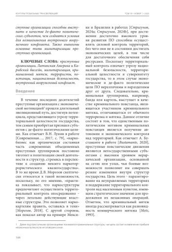 За последние три десятилетия некоторые банды и картели в Латинской Америке и Карибском бассейне (ЛАКБ) достигли новых эволюционных уровней, создав угрозу территориальной целостности государств. Эти преступные организации (ПО) непрерывно внедряют организационные и технологические инновации, что способствует их милитаризации. Цель данной работы на примере ряда латиноамериканских банд и картелей показать милитаризацию этих ПО как фактор их трансформации в де-факто политические субъекты криминального мятежа и участников внутреннего вооруженного конфликта. Установлено, что влияние милитаризации на эволюцию преступных организаций в условиях криминального мятежа коренным образом отличается от влияния на организованную преступность кооптации ею сотрудников силовых ведомств и получения преступниками доступа к вооружению в тех странах, где отсутствуют условия для криминального мятежа. Данный вывод основывается на том, что в криминальном мятеже милитаризация преступных организаций делает возможным прямое противодействие государству со стороны преступников вплоть до создания прямой угрозы его территориальной целостности. Вследствие этого преступные организации способны выступать в качестве де-факто политических субъектов, чем создаются условия для возникновения внутреннего вооруженного конфликта. Также выявлены основные типы милитаризации преступных организаций.