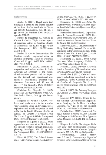 10. Bustamante A. Insurgencias criminales y guerra urbana en Latinoamerica: Una aproximación al proceso de urbanización regional ysu impacto en la evolución táctica y operativa de las organizaciones criminales trasnacionales // Entretextos. - 2020. - Vol. 12, N 35. - P. 1-17. - Исп. яз. - https://doi.org/10.59057/iberoleon.20075316.20203556.