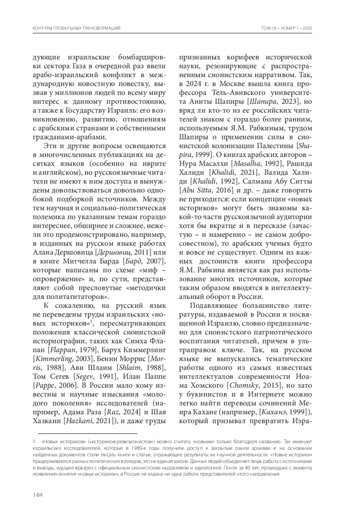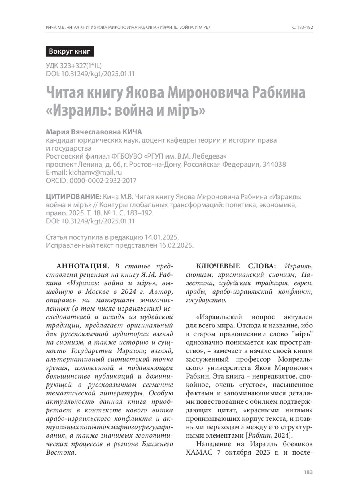 В статье представлена рецензия на книгу Я. М. Рабкина «Израиль: война и мiръ», вышедшую в Москве в 2024 г. Автор, опираясь на материалы многочисленных (в том числе израильских) исследователей и исходя из иудейской традиции, предлагает оригинальный для русскоязычной аудитории взгляд на сионизм, а также историю и сущность Государства Израиль; взгляд, альтернативный сионистской точке зрения, изложенной в подавляющем большинстве публикаций и доминирующей в русскоязычном сегменте тематической литературы. Особую актуальность данная книга приобретает в контексте нового витка арабо-израильского конфликта и актуальных попыток мирного урегулирования, а также значимых геополитических процессов в регионе Ближнего Востока.