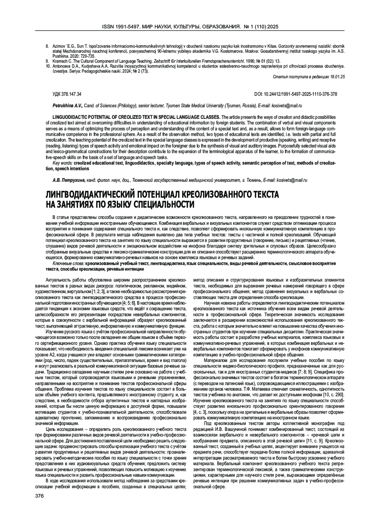 5. 	Осиянова А.В., Осиянова О.М., Темкина В.Л. Креолизованные тексты в современном языковом образовании: дидактический аспект. Вестник Оренбургского государственного университета. 2022; № 4 (236): 53-59. EDN: BNFEOF